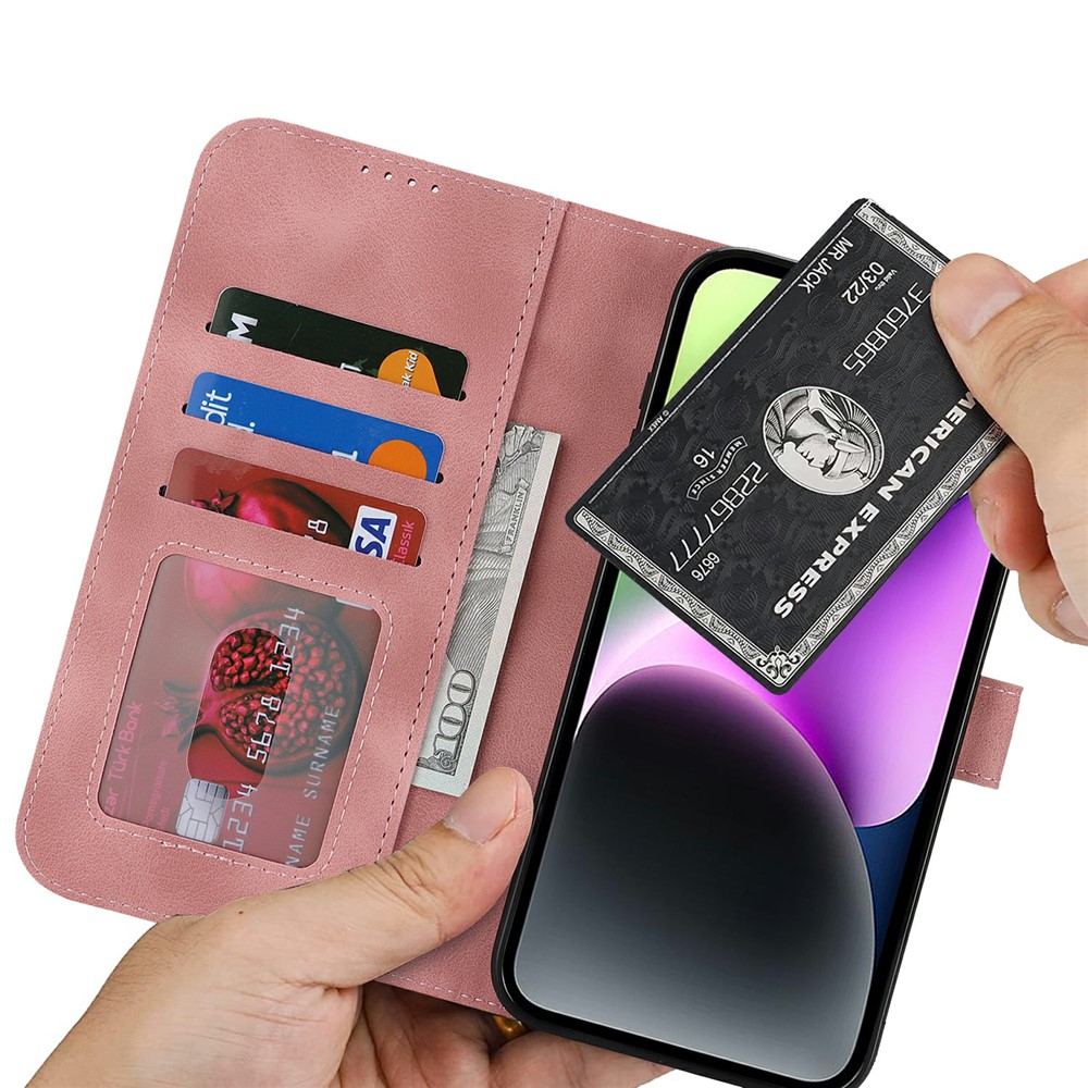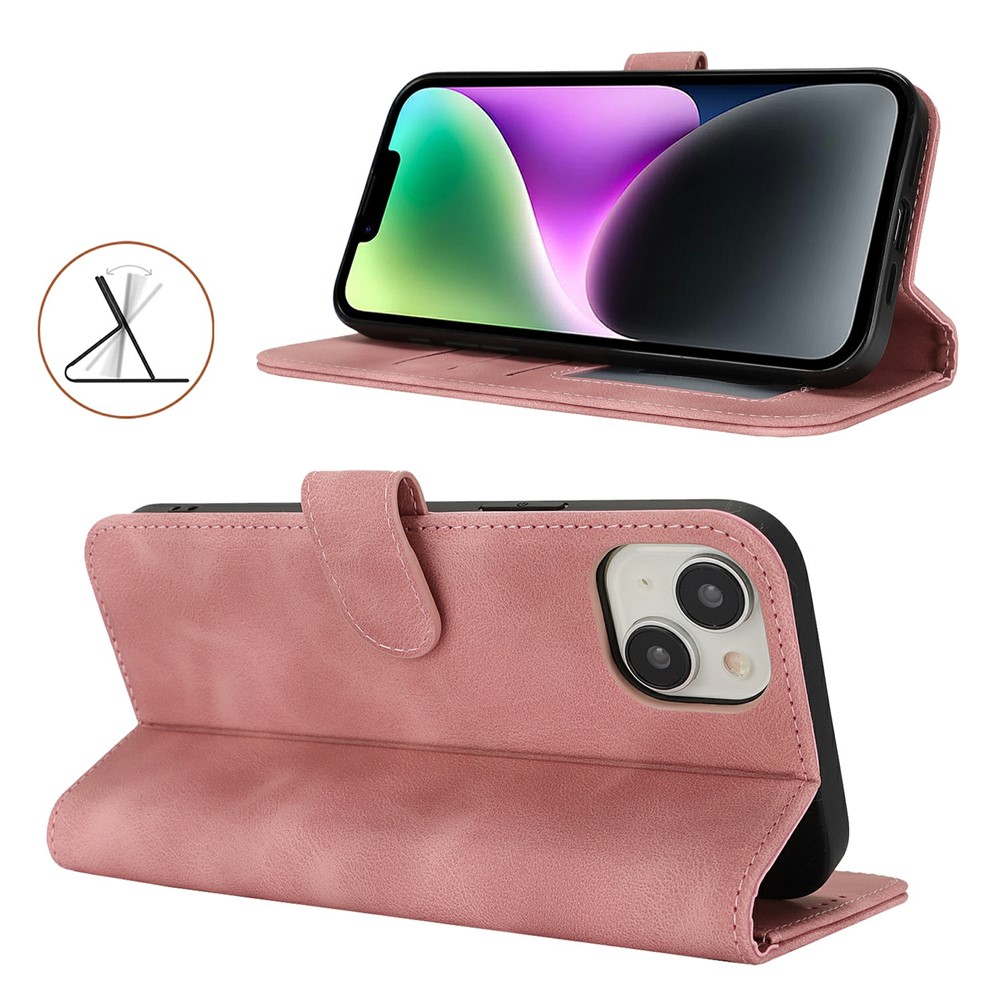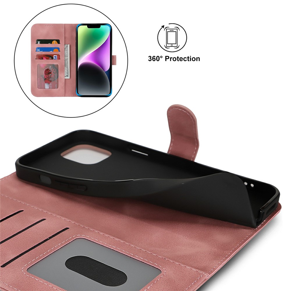 For iPhone 14 / 13 Wallet Case Double Folded Edge Skin Touch PU Leather Flip Phone Cover – Rose Pink