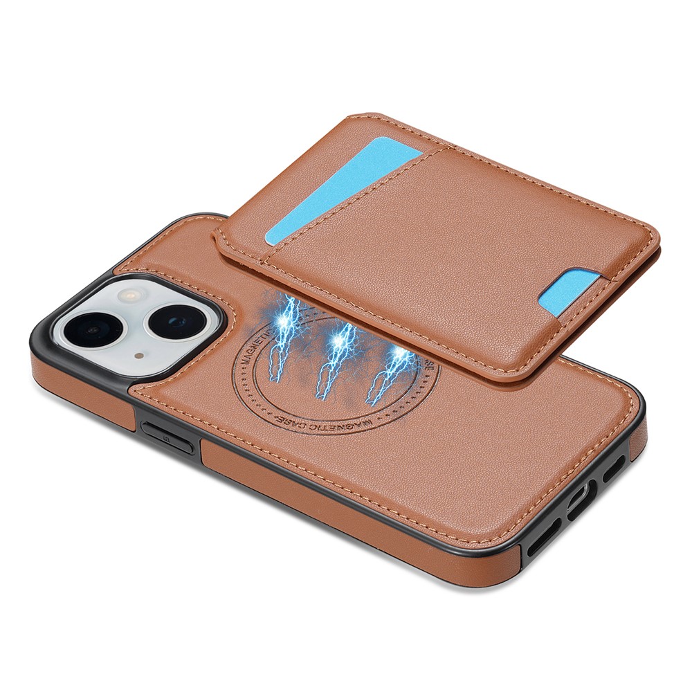 For iPhone 14 Case Compatible with MagSafe Detachable Card Holder Kickstand Leather Phone Back Cover - Brown