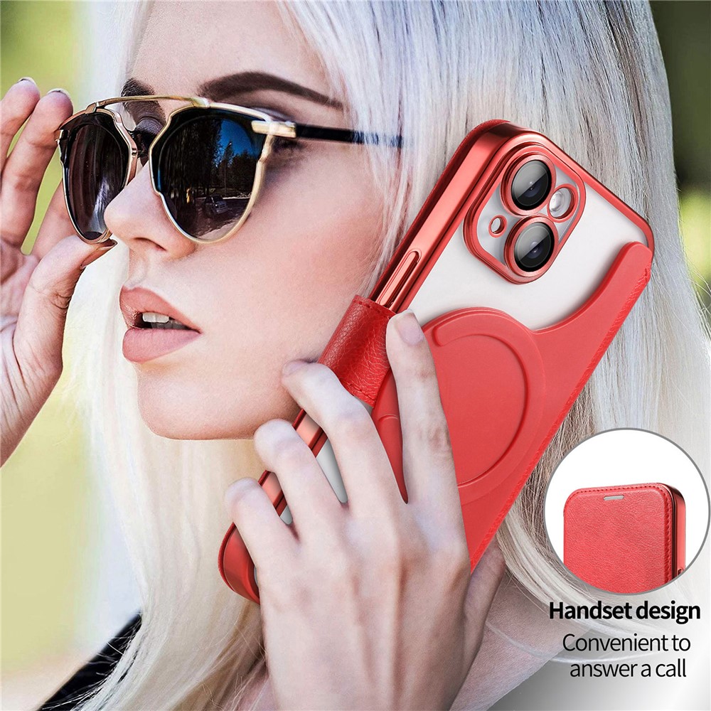 For iPhone 14 Case Compatible with MagSafe Detachable Leather Phone Cover with Lens Film - Red
