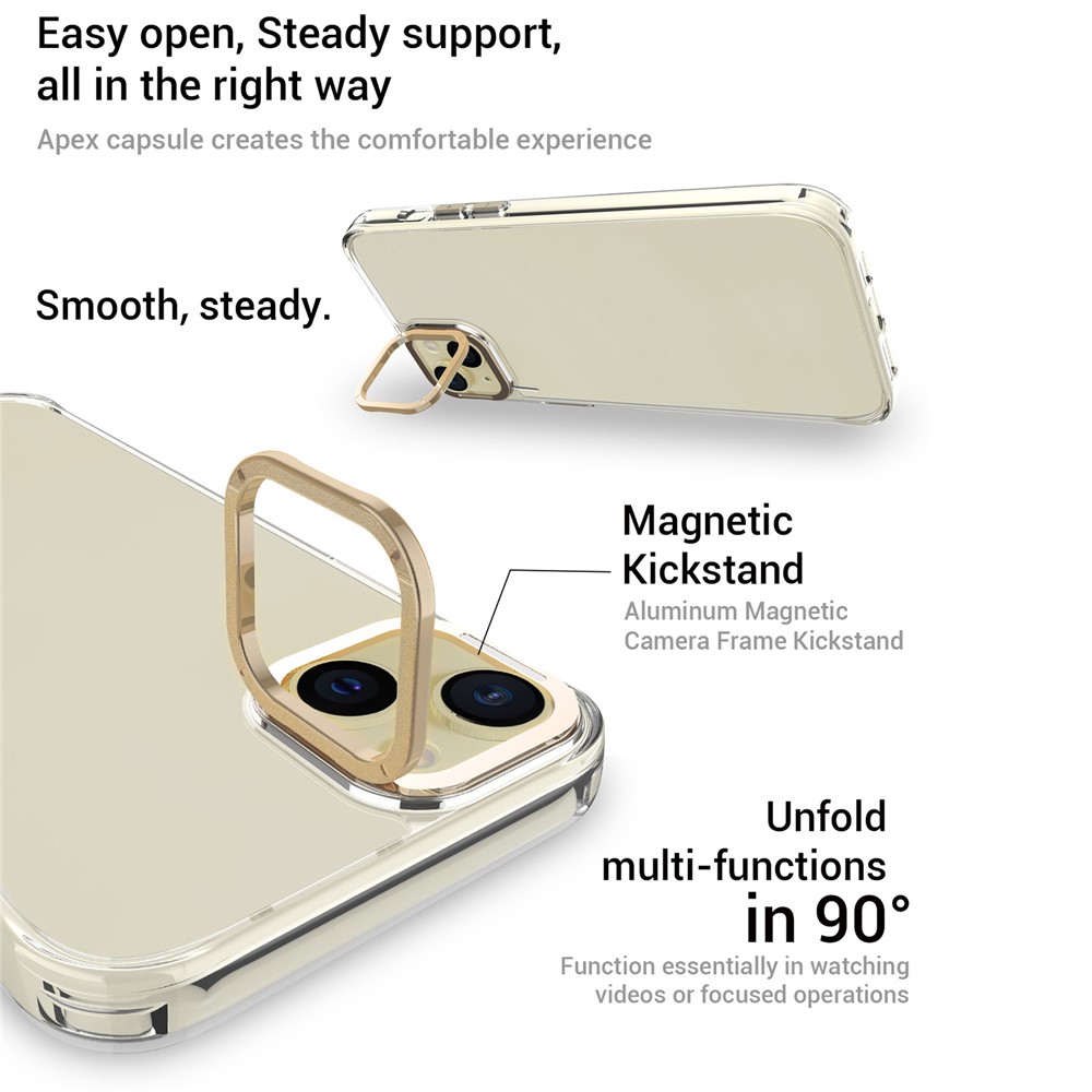 - Camera Frame Kickstand Metal lens kickstand with damping design allows free-angle adjustments (0-90°) for hands-free viewing, photography, or travel convenience
