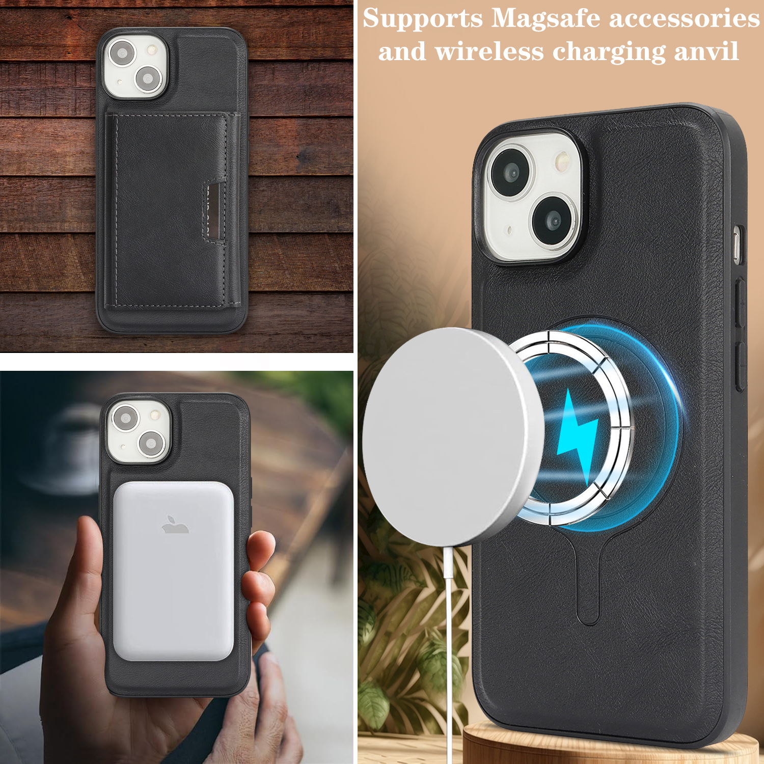 • MagSafe Compatible Supports for MagSafe accessories and wireless charging, featuring a minimalist magnetic leather bi-fold design with card holder functionality.