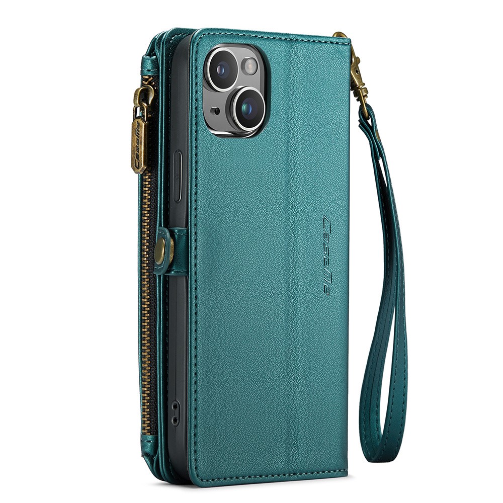 For iPhone 14 Plus Leather Case CASEME C36 Zipper Multiple Card Slots Phone Cover with Straps – Green