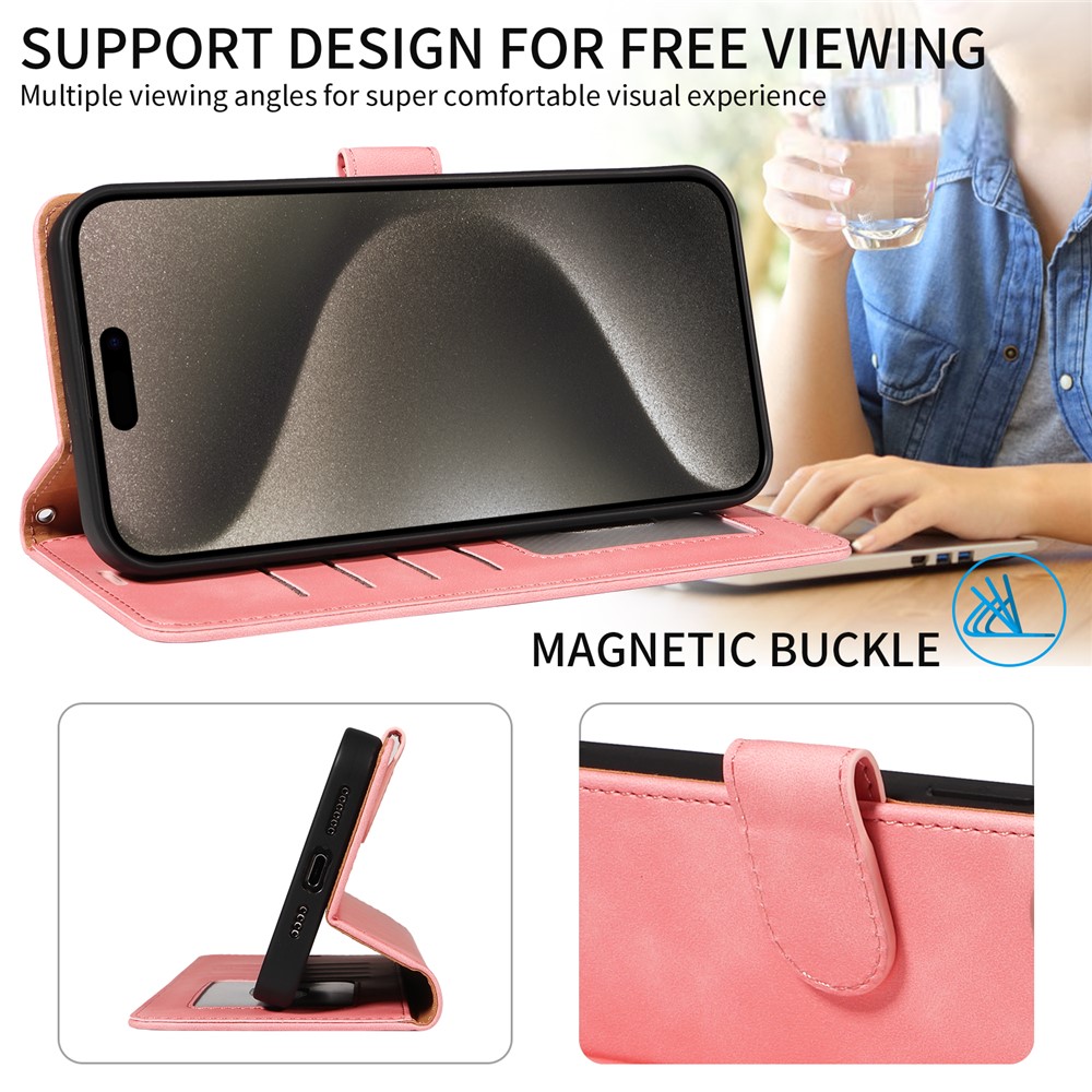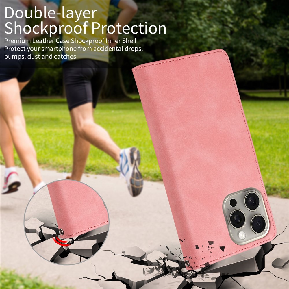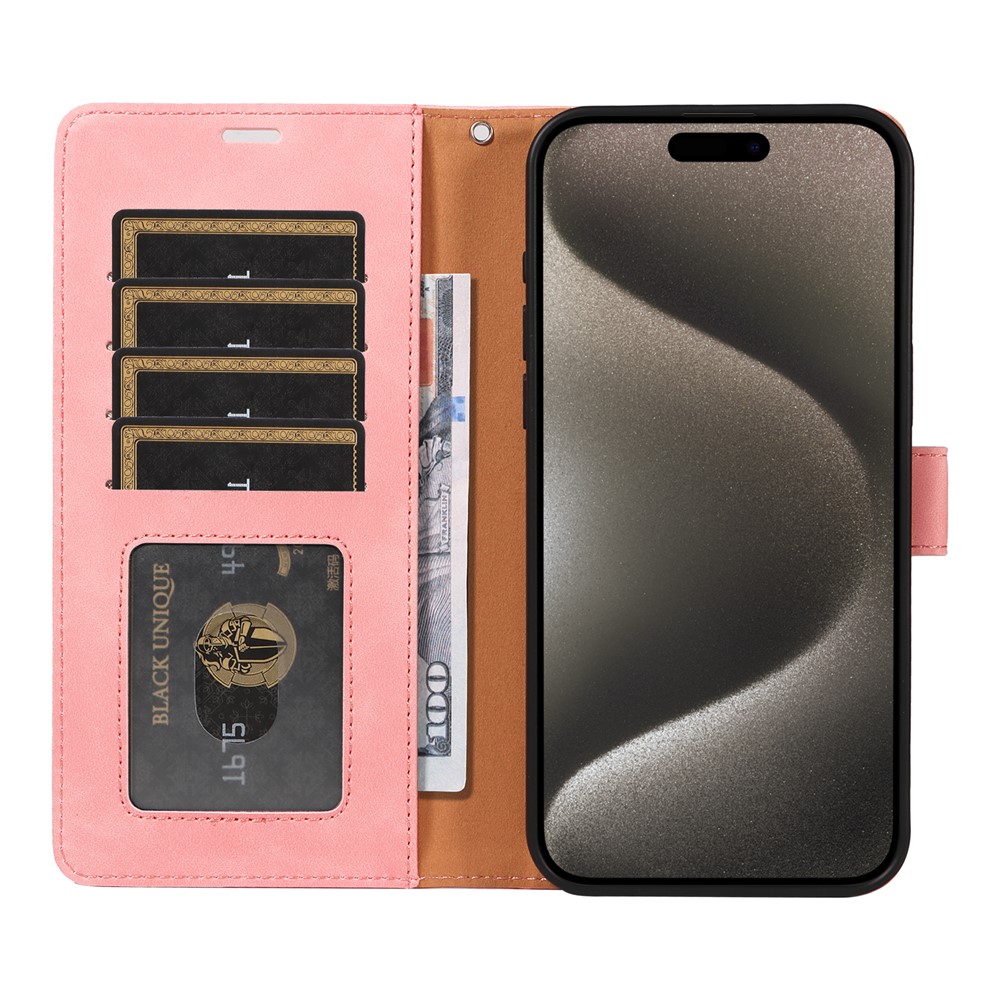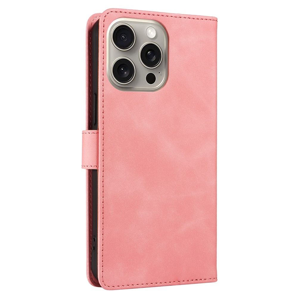 For iPhone 14 Pro Case RFID Blocking Wallet Stand Leather Flip Phone Cover with Slim Strap – Pink
