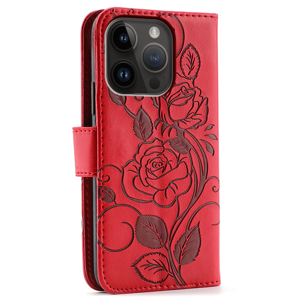 For iPhone 14 Pro Case Wallet Stand Imprinted Rose Butterfly PU Leather Phone Cover - Red