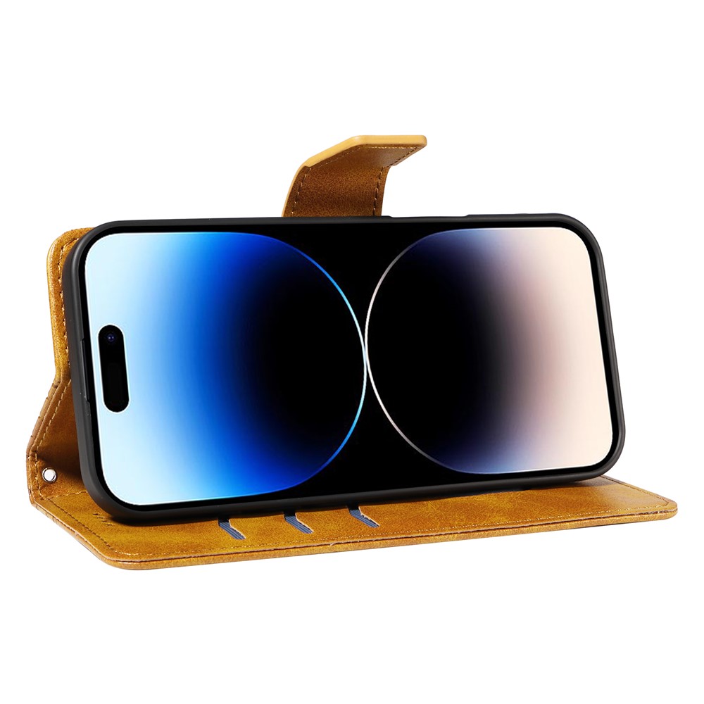 For iPhone 14 Pro Leather Case Wallet Stand Grids Imprinted Phone Cover with Strap - Yellow $15.71