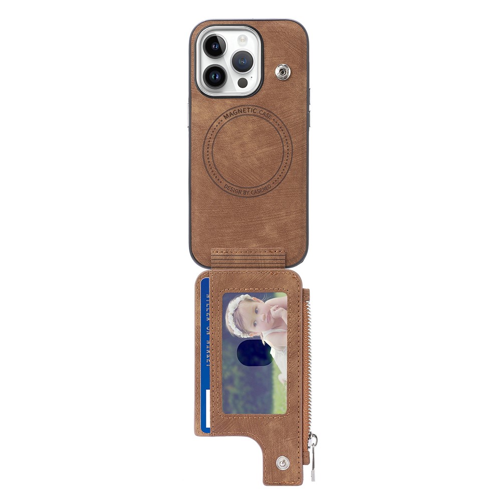 For iPhone 14 Pro Magnetic Case Card Holder Kickstand TPU + Leather Back Cover – Brown