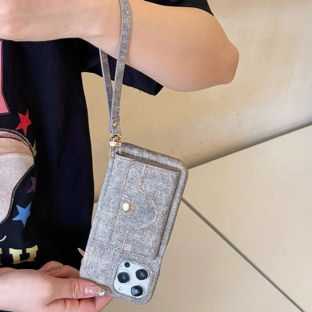 For iPhone 14 Pro Max Case Card Slots Mirror Design Jeans Cloth Texture PU Leather Back Cover with Strap - Grey $20.22