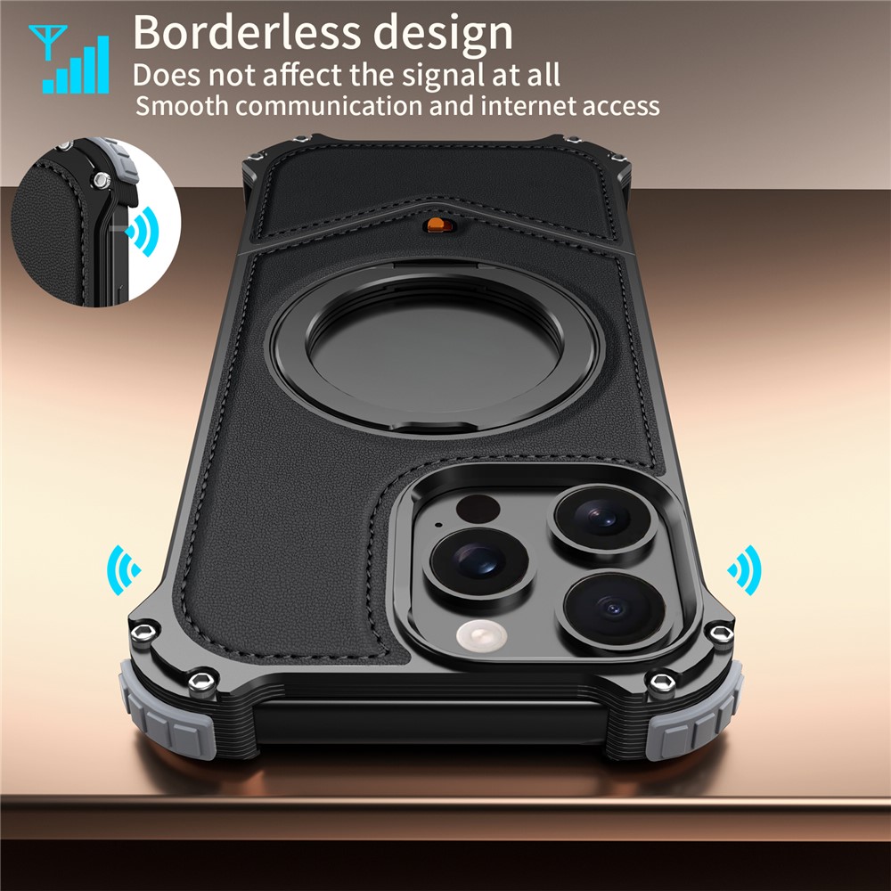 • For iPhone 14 Pro Max Case PU Covered Metal Boardless Phone Back Cover with Kickstand - Black  /  Silver