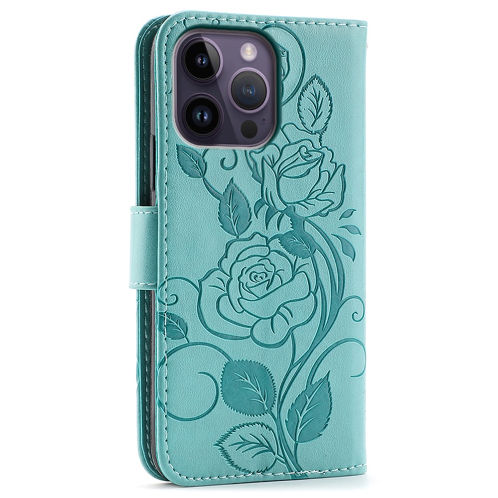 For iPhone 14 Pro Max Case Wallet Stand Imprinted Rose Butterfly PU Leather Phone Cover – Green
