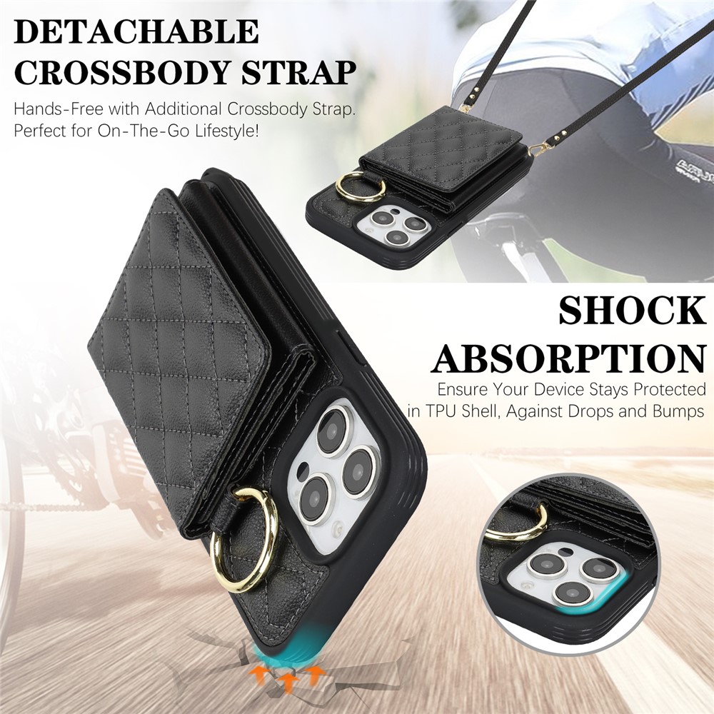 For iPhone 14 Pro Max Case with Lanyard / Mirror / Card Holder Grids Pattern RFID Blocking Phone Cover – Black