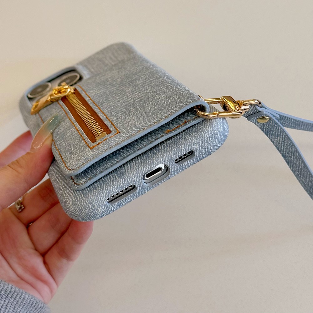 For iPhone 14 Pro Max Case Zipper Card Holder Kickstand Jeans Cloth Texture PU Leather Back Cover with Strap