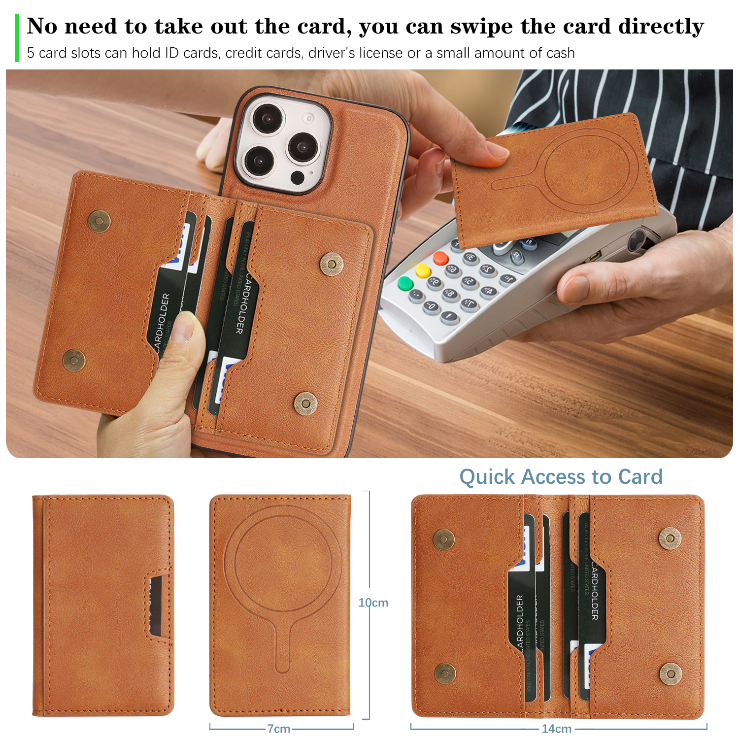 - MagSafe Compatible Supports for MagSafe accessories and wireless charging, featuring a minimalist magnetic leather bi-fold design with card holder functionality.