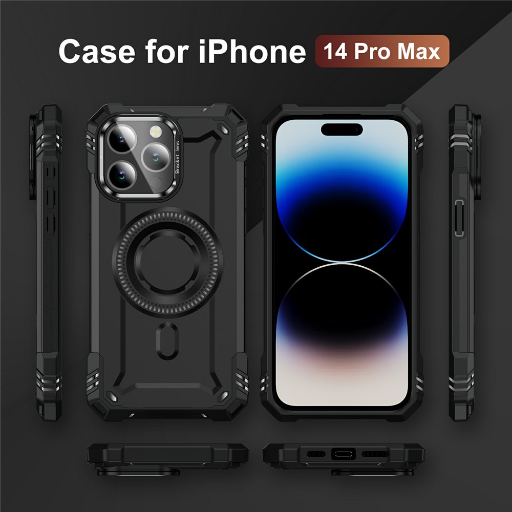 For iPhone 14 Pro Max Magnetic Case Lens Kickstand PC + TPU Shockproof Phone Cover – Black