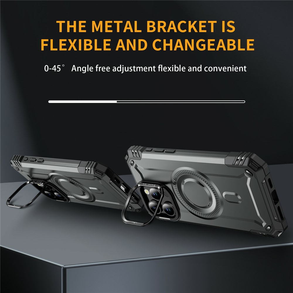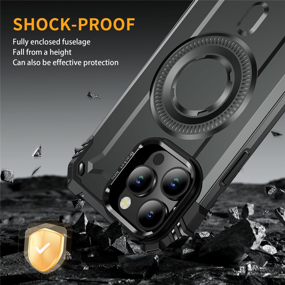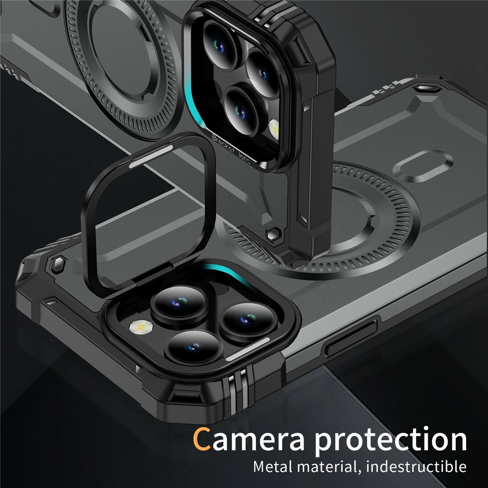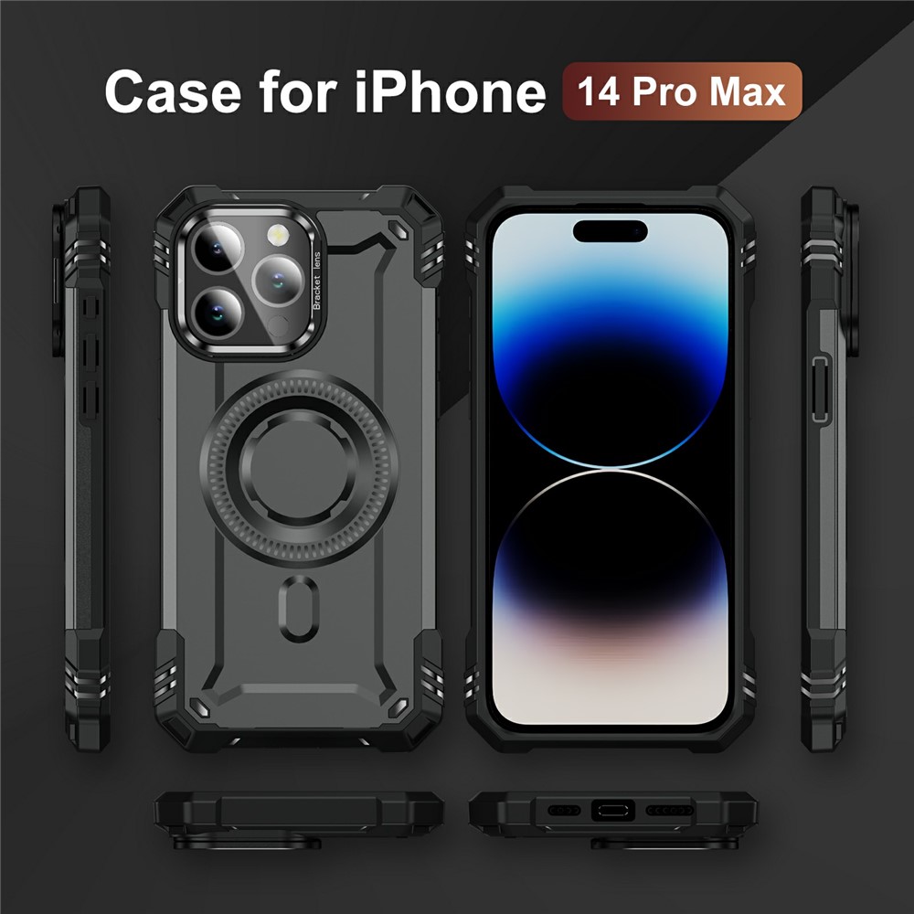 • For iPhone 14 Pro Max Magnetic Case Lens Kickstand PC + TPU Shockproof Phone Cover - Black