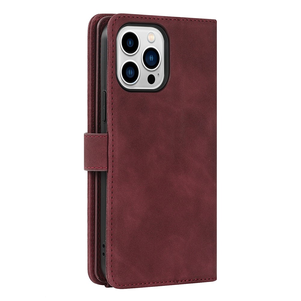 For iPhone 14 Pro Stand Case PU Leather Phone Cover with Straps / Zipper Wallet / Multiple Card Slots – Wine Red