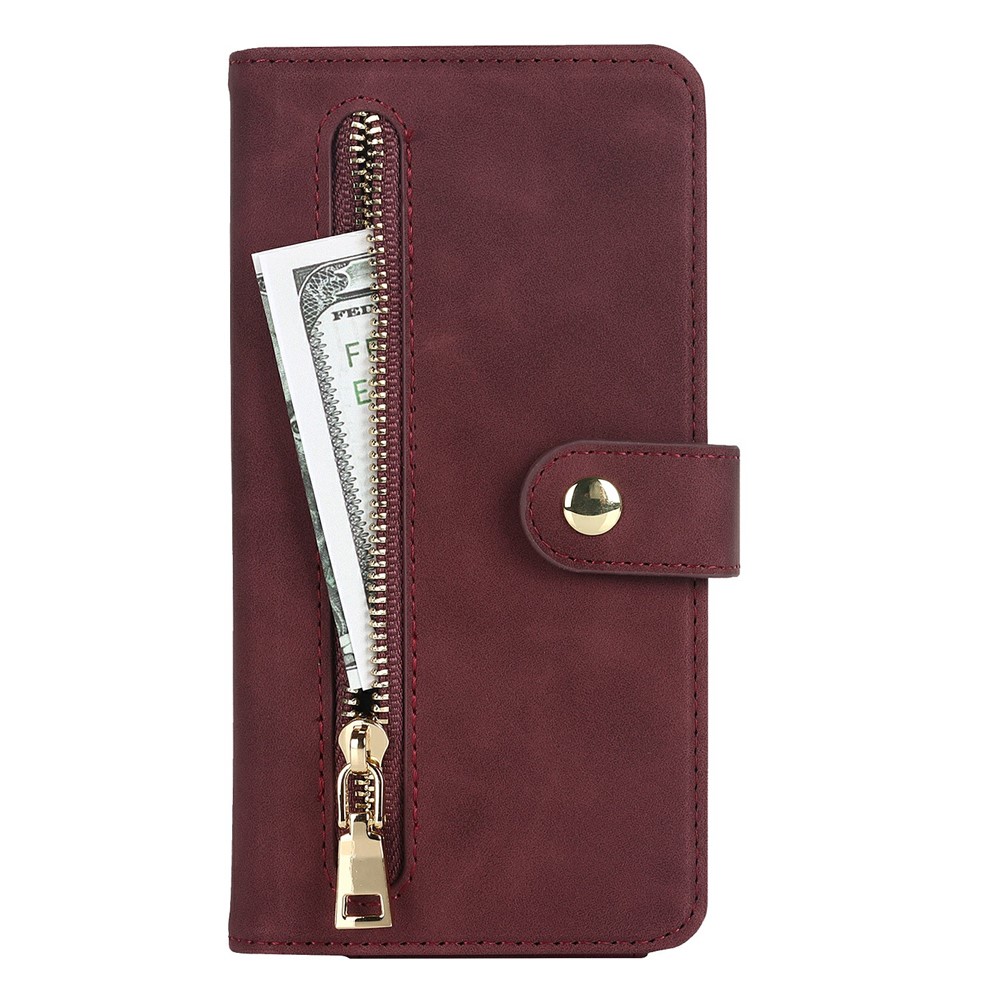 For iPhone 14 Pro Stand Case PU Leather Phone Cover with Straps / Zipper Wallet / Multiple Card Slots - Wine Red $20.22