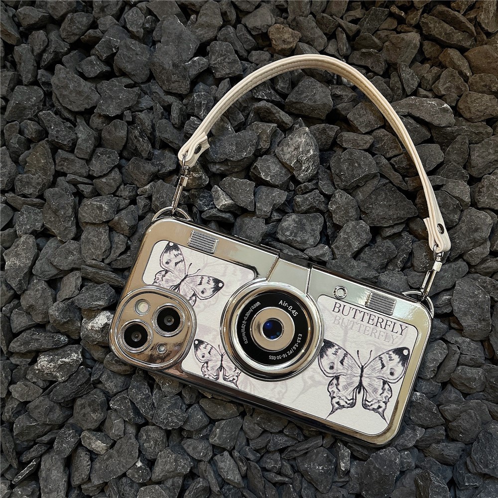 For iPhone 14 TPU Cover Electroplating Camera Design Butterfly Pattern Phone Case with Leather Strap