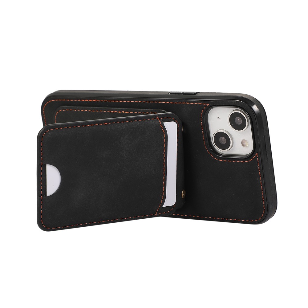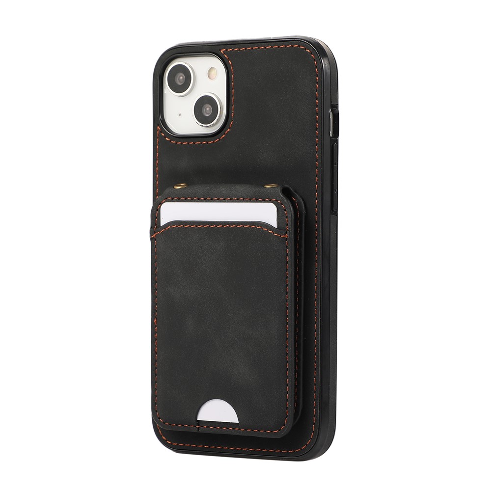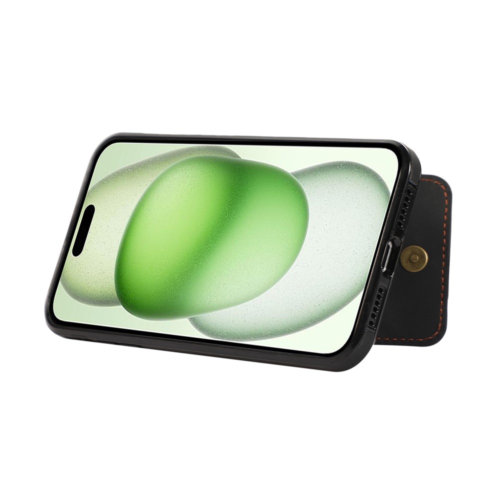 For iPhone 15 Case Card Holder Kickstand Leather + TPU Phone Cover with Shoulder Strap – Black
