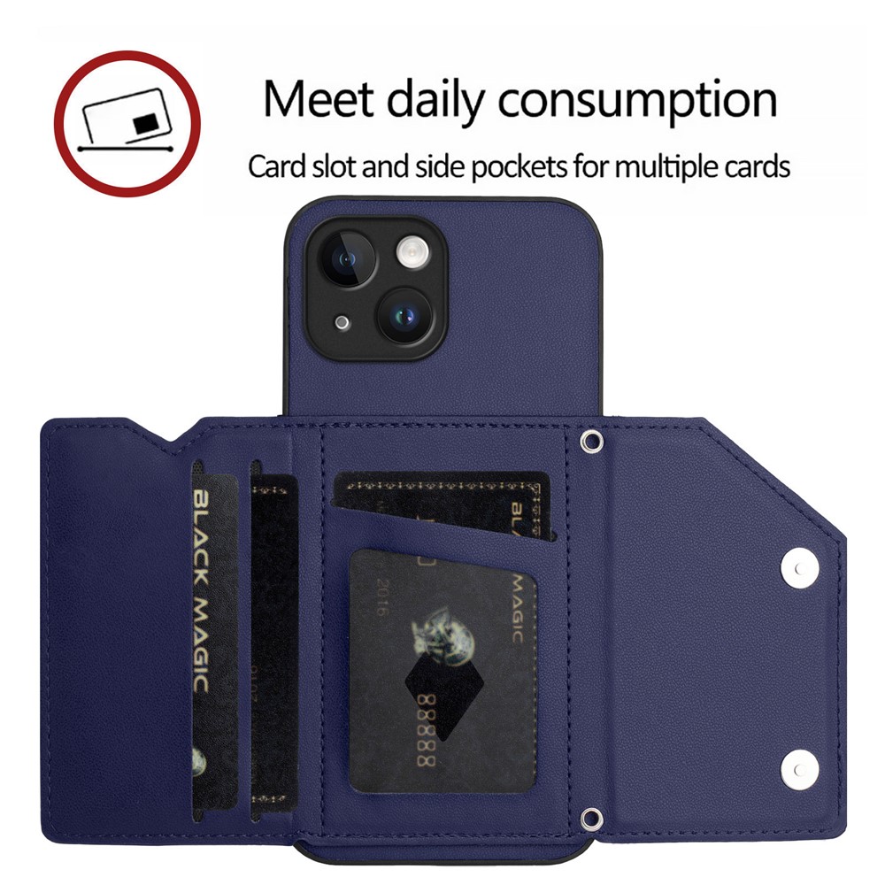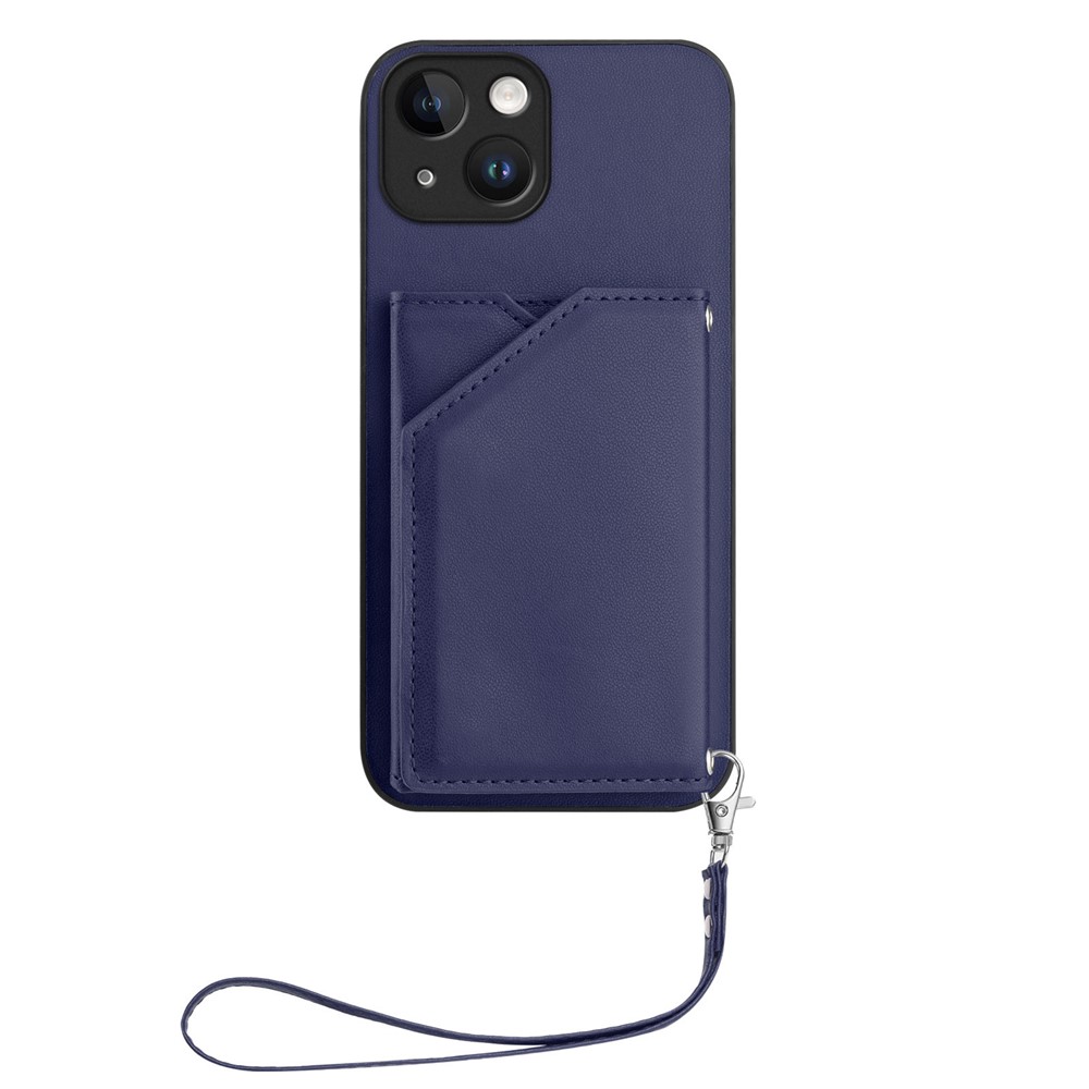 For iPhone 15 Case Card Holder Kickstand Skin-Touch Phone Cover with Wrist Strap - Blue
