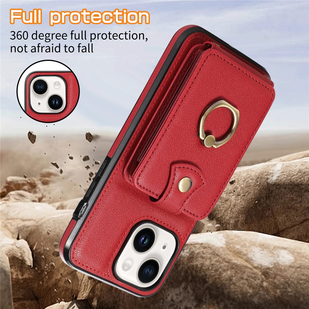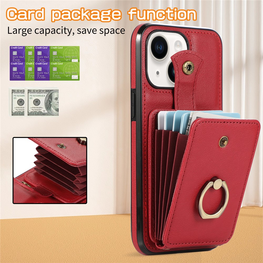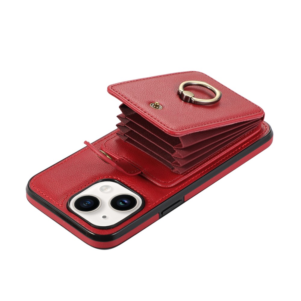 - Accordion-Style Card Holder The back of the case features an accordion-style cardholder with a magnetic button closure, perfect for storing essential cards and cash securely
