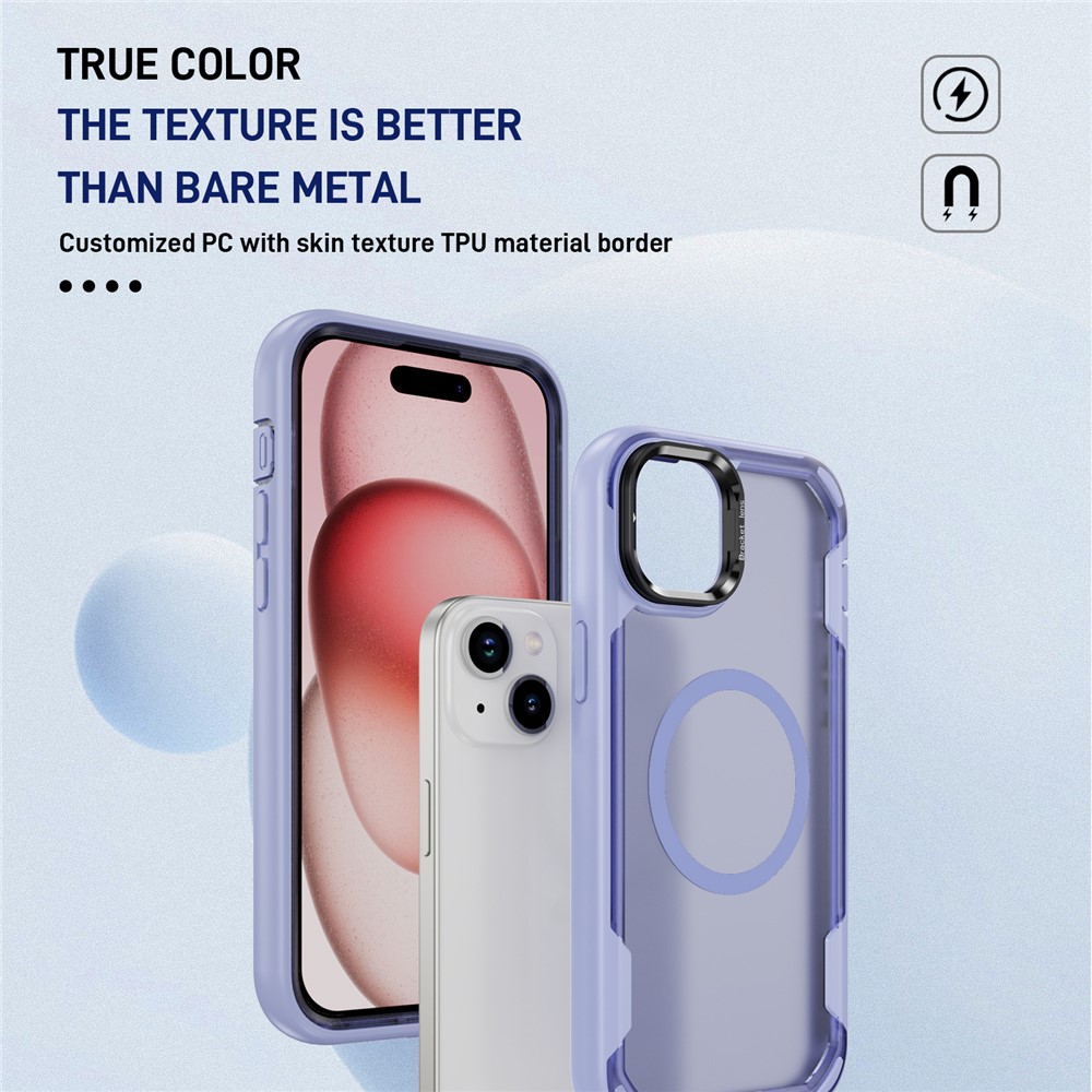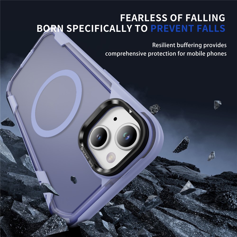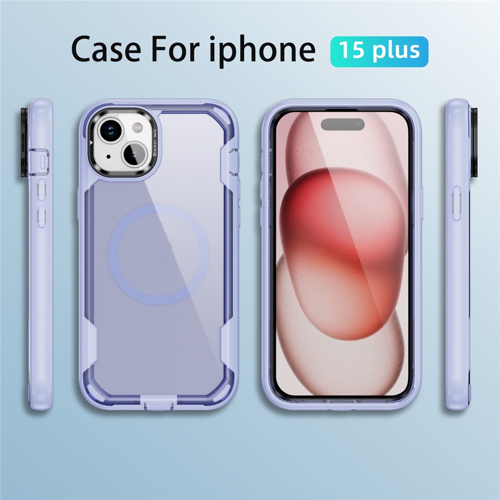• For iPhone 15 Case Compatible with MagSafe Lens Frame Kickstand TPU + PC Shockproof Phone Cover - Purple + Bright Purple
