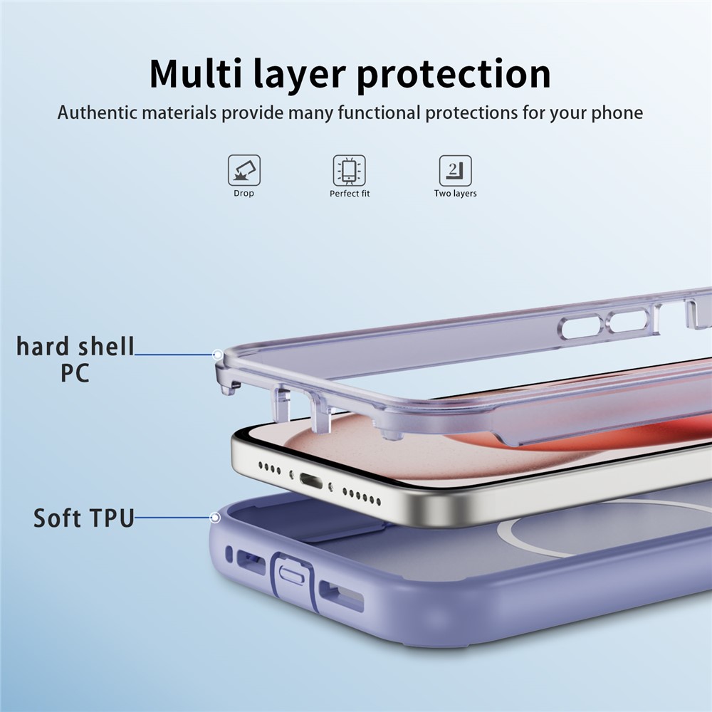 For iPhone 15 Case Compatible with MagSafe Lens Frame Kickstand TPU + PC Shockproof Phone Cover – Light Purple + Transparent Purple