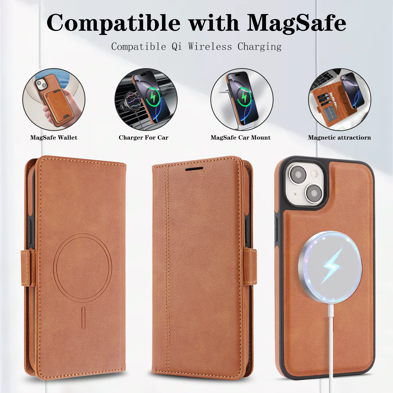 For iPhone 15 Case Detachable 2 in 1 Leather Wallet Phone Cover Compatible with MagSafe – Brown