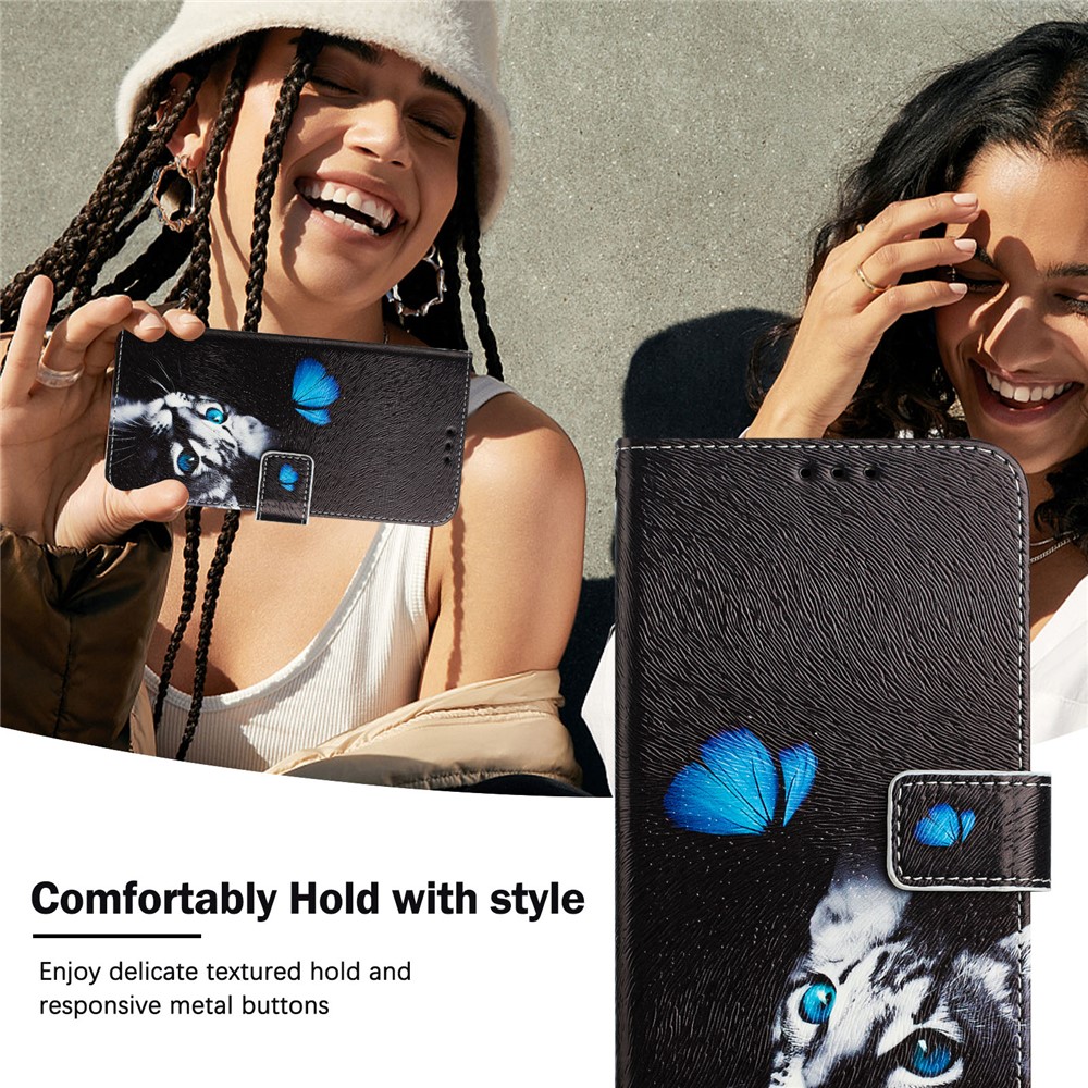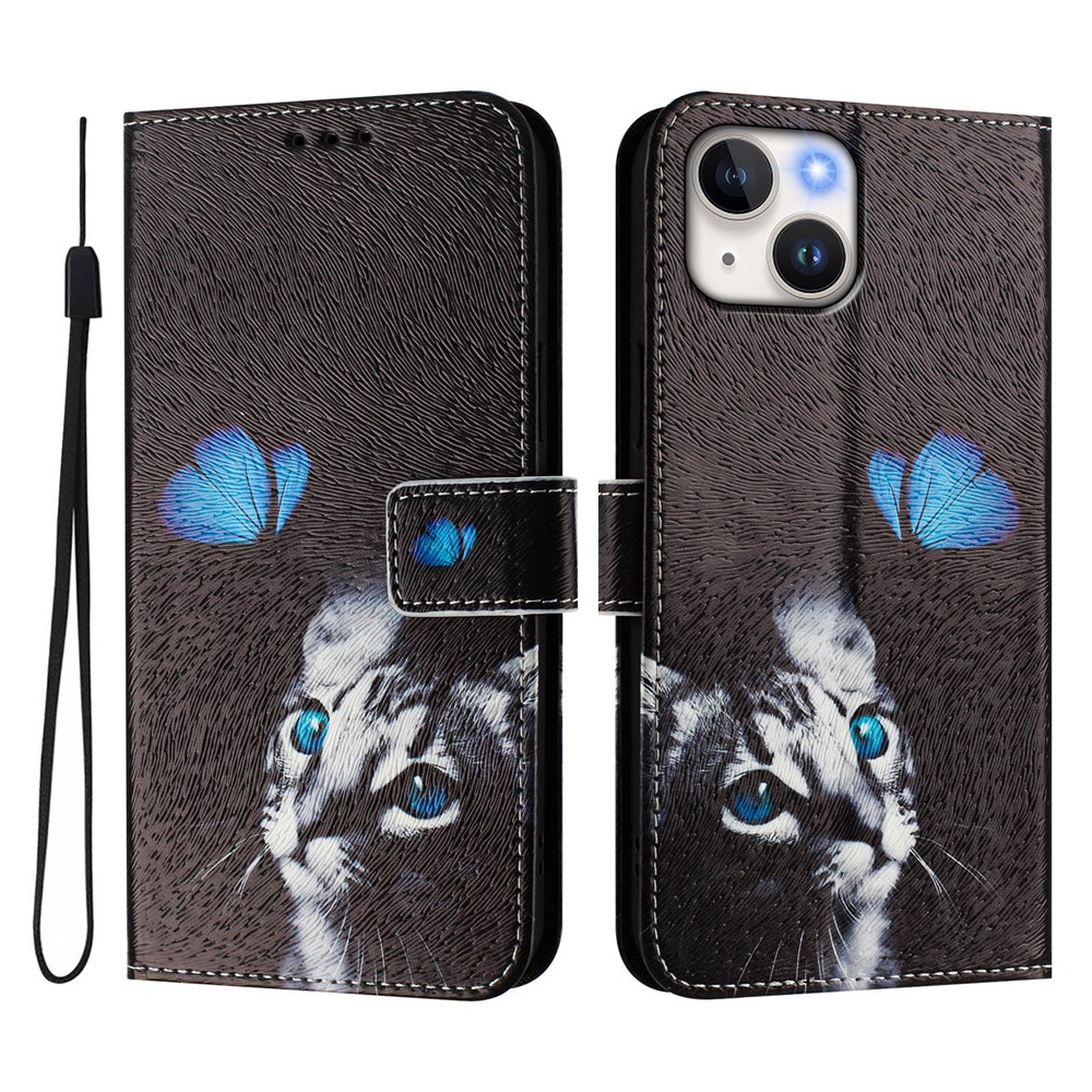 For iPhone 15 Case Pattern Printing Wallet Phone Cover with Strap – Butterfly and Cat