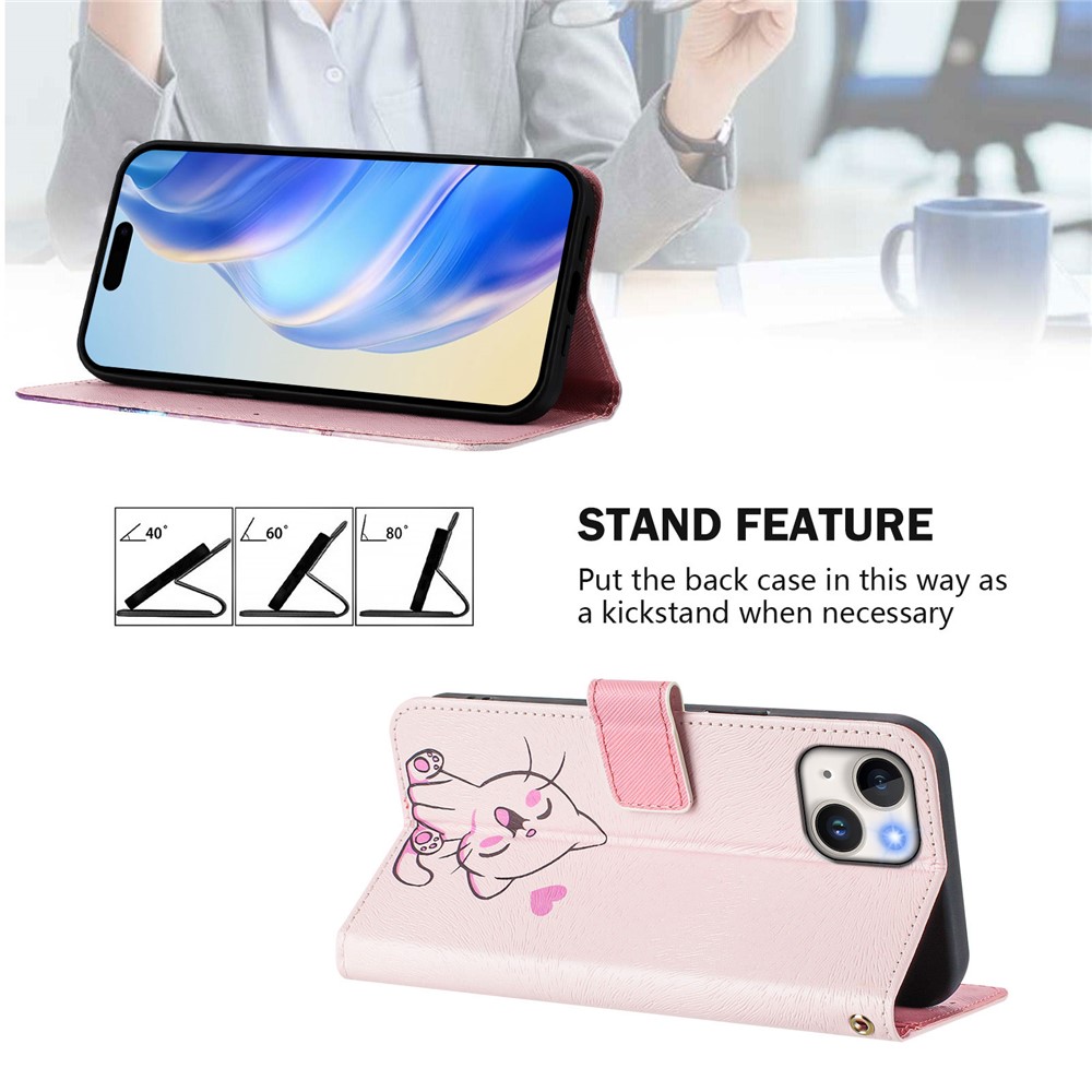 For iPhone 15 Case Pattern Printing Wallet Phone Cover with Strap – Cute Cat