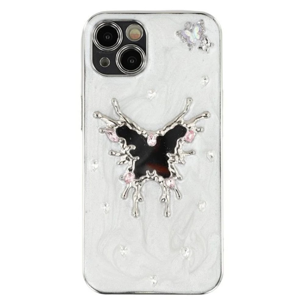 For iPhone 15 Case WANLONFENG Electroplated Epoxy TPU + Acrylic Phone Cover with Tempered Glass – Big Butterfly