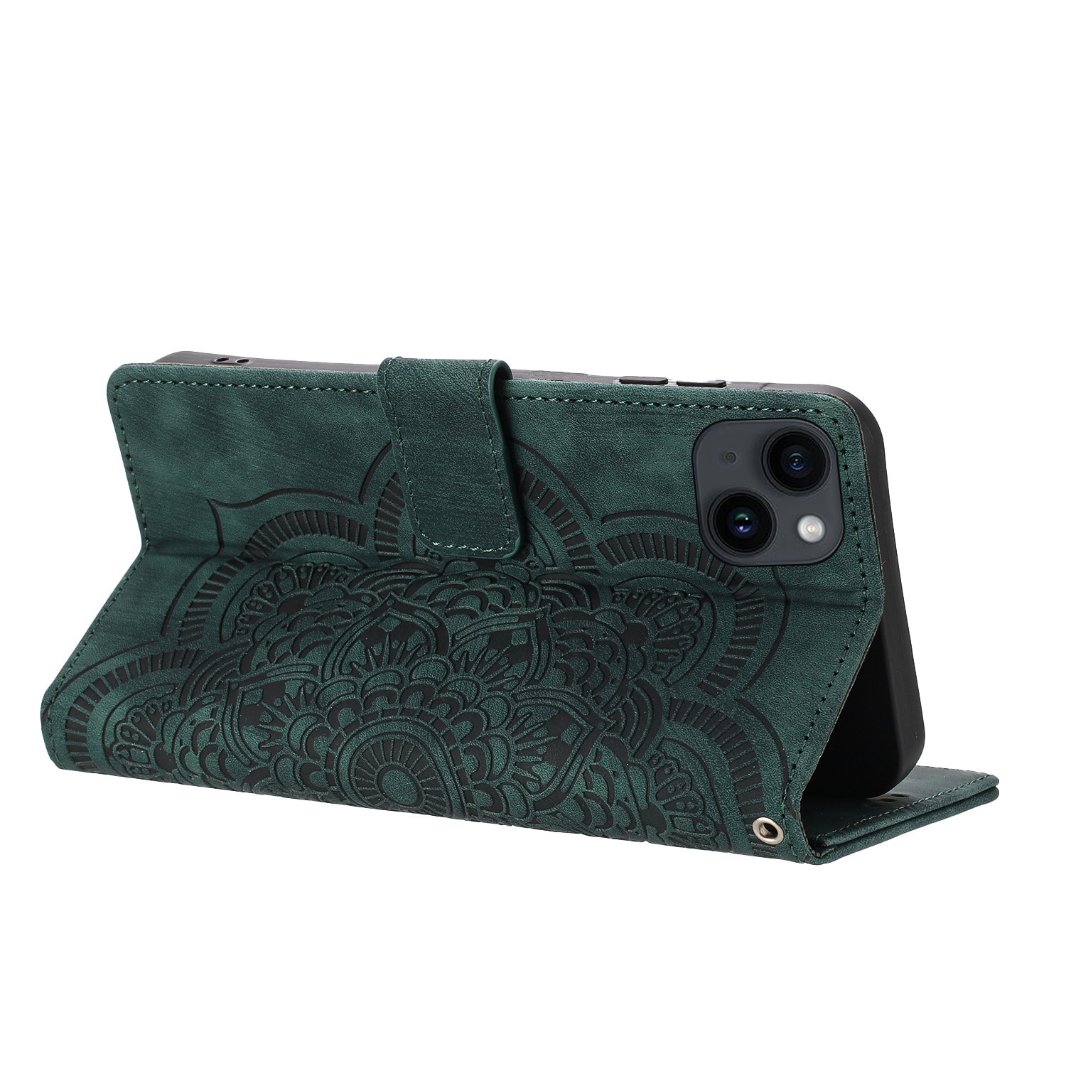 For iPhone 15 Case with 2Pcs Tempered Glass WANLONFENG MTL Series Mandala Leather Phone Cover - Midnight Green