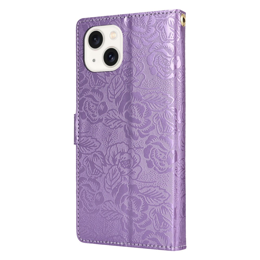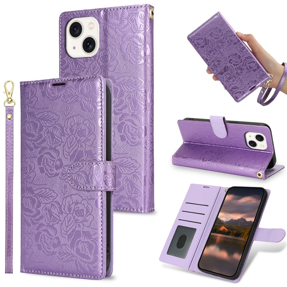 For iPhone 15 Case with Hand Strap Flower Imprint Leather Wallet Phone Cover - Purple
