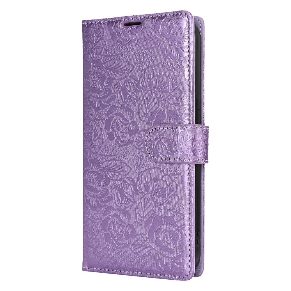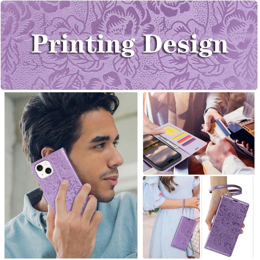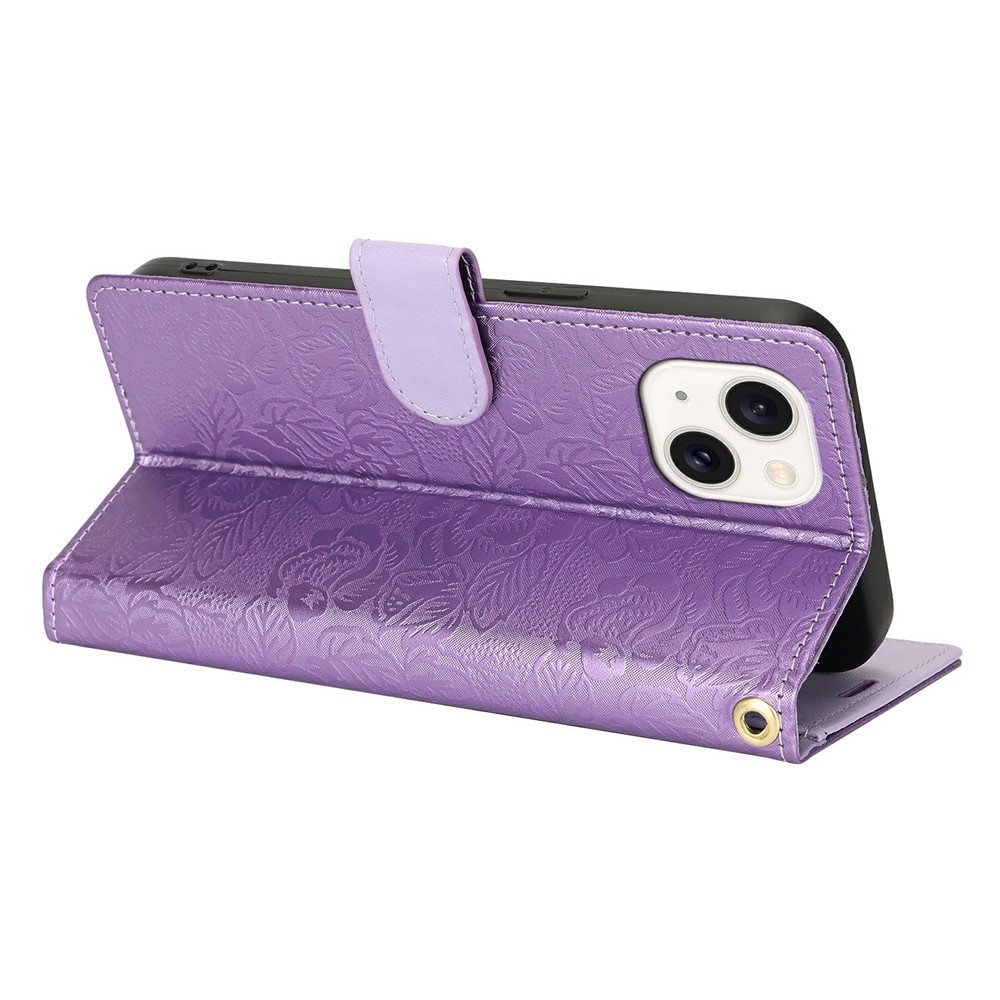 For iPhone 15 Case with Hand Strap Flower Imprint Leather Wallet Phone Cover – Purple