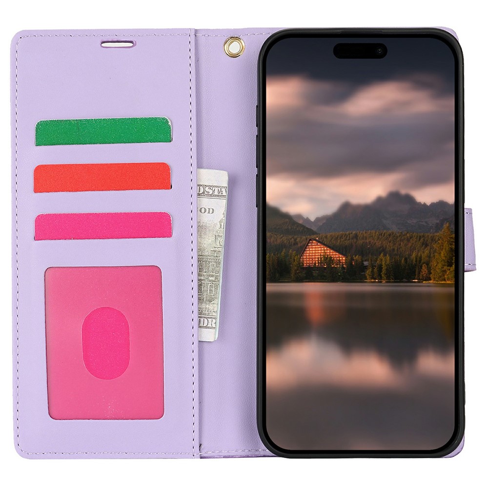 For iPhone 15 Case with Hand Strap Flower Imprint Leather Wallet Phone Cover - Purple $16.61