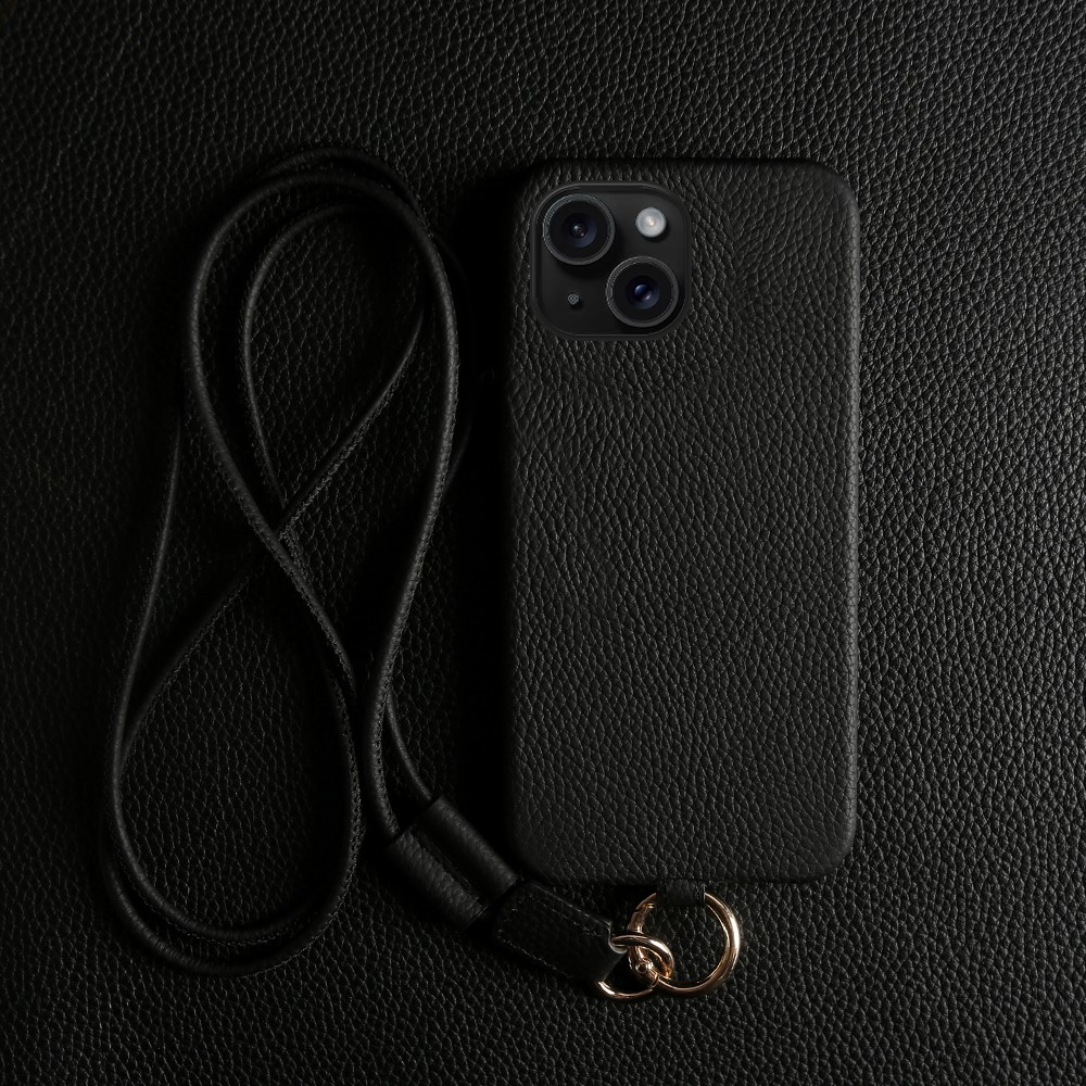 For iPhone 15 Case with Lanyard Genuine Cow Leather PC Phone Back Cover – Black