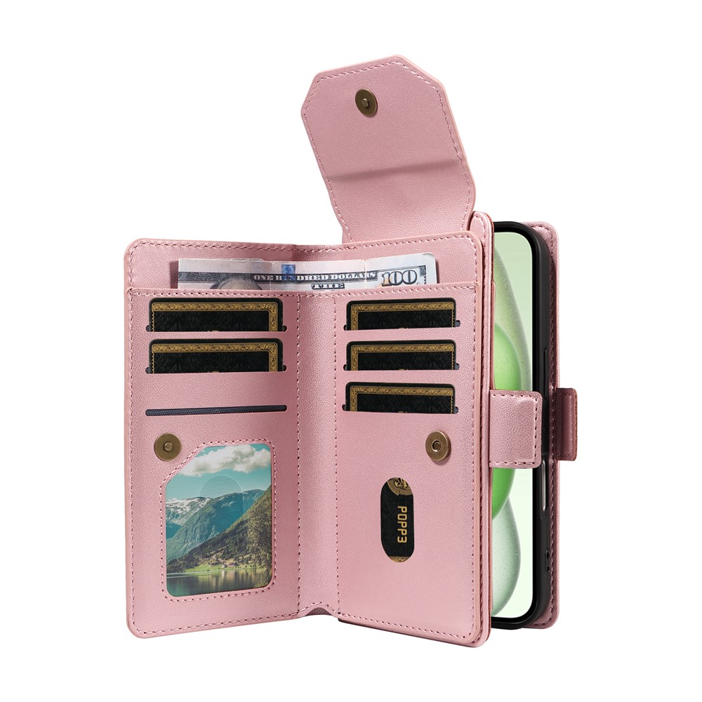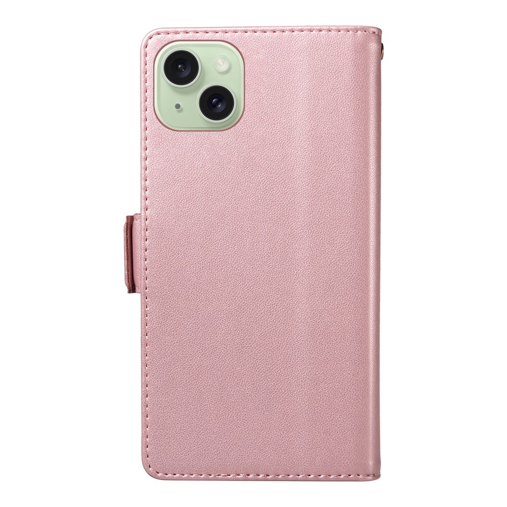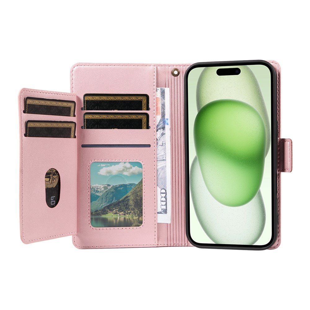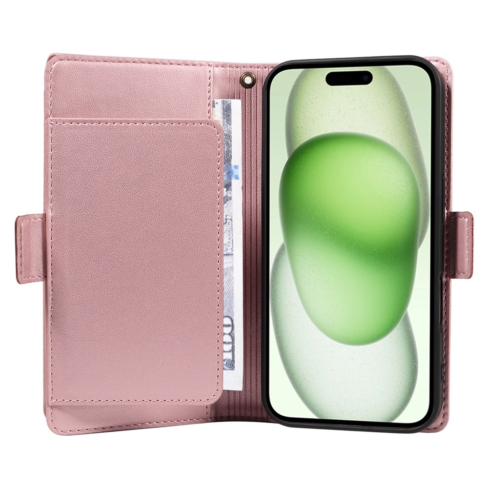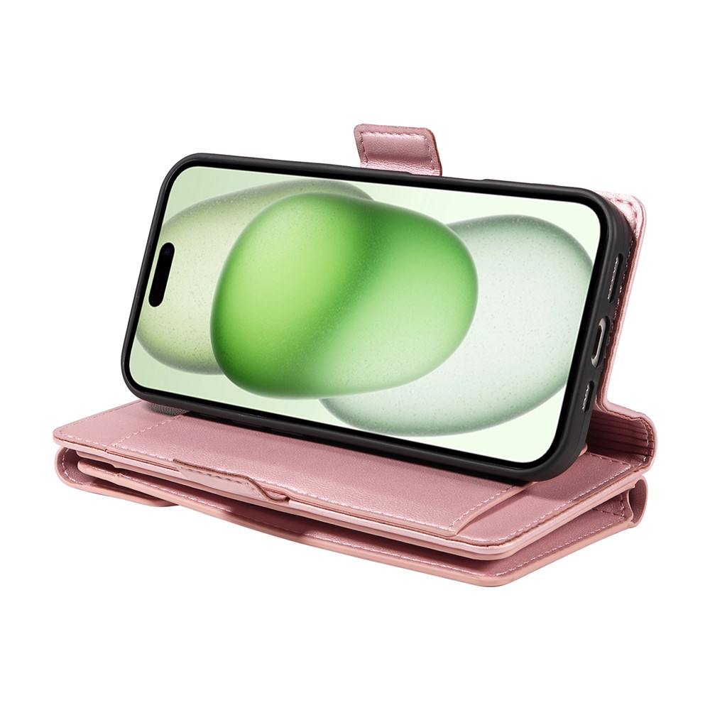 For iPhone 15 Case with Multi-Card Holder and Strap PU Leather Phone Cover Stand – Rose Gold