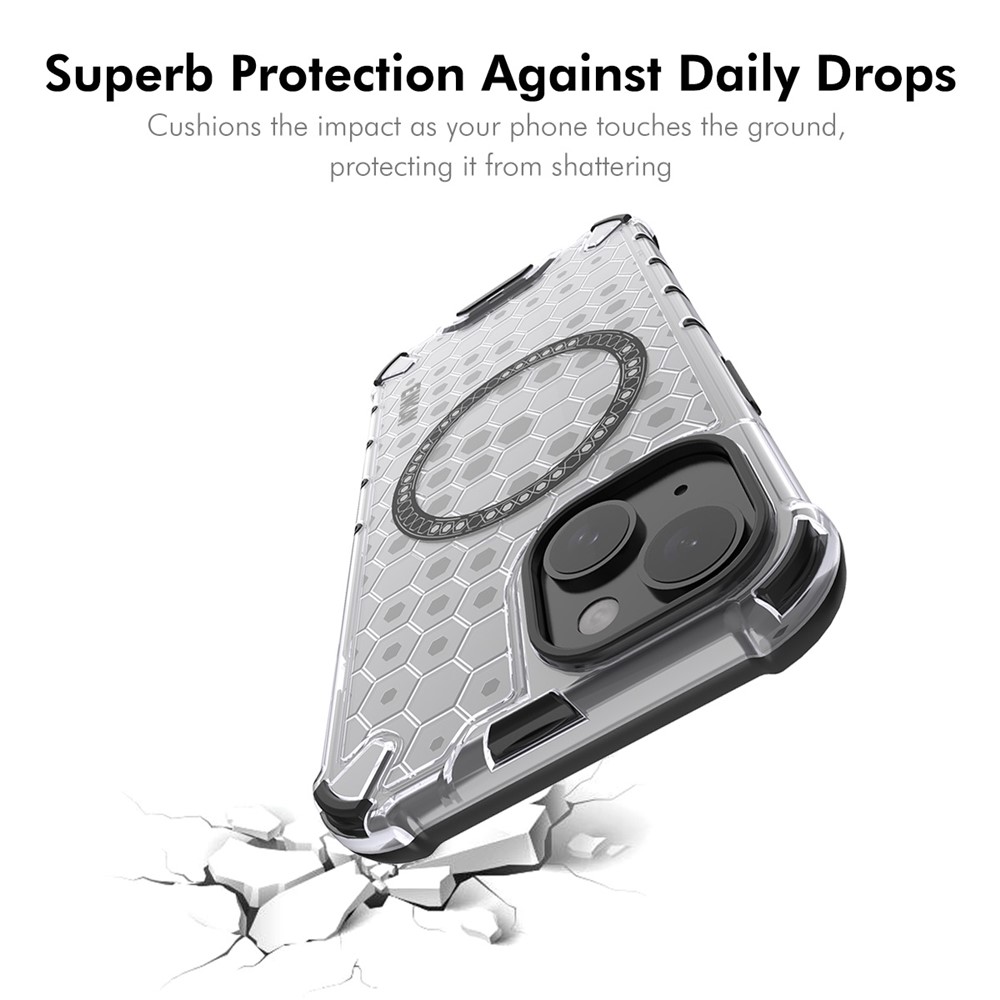 • For iPhone 15 ENKAY Hat-Prince Magnetic Case Honeycomb Design TPU+PC Phone Cover + Large Arc Edge Screen Protector - White