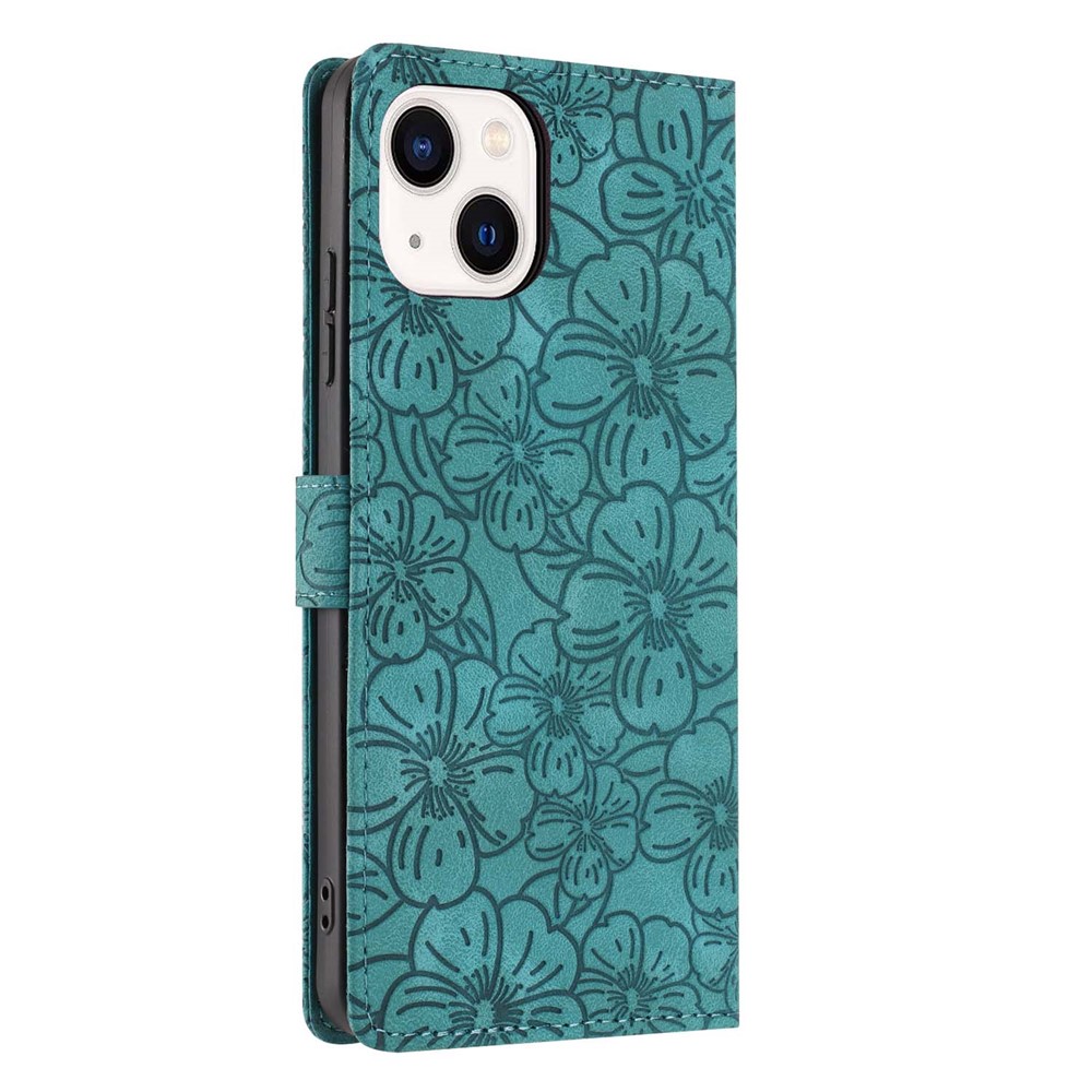 For iPhone 15 Flip Case Cherry Blossom Pattern Leather Wallet Stand Phone Cover with Wrist Strap – Green
