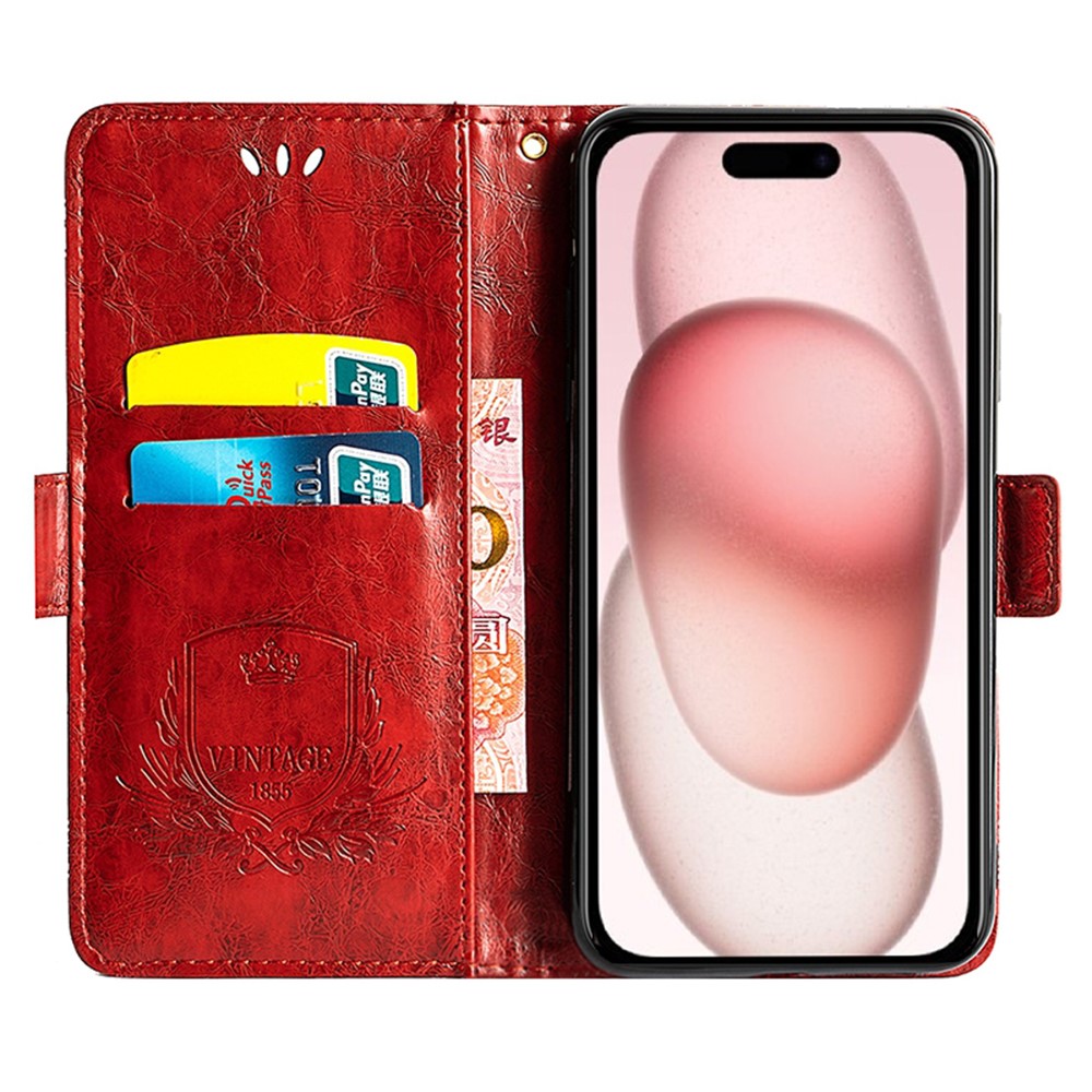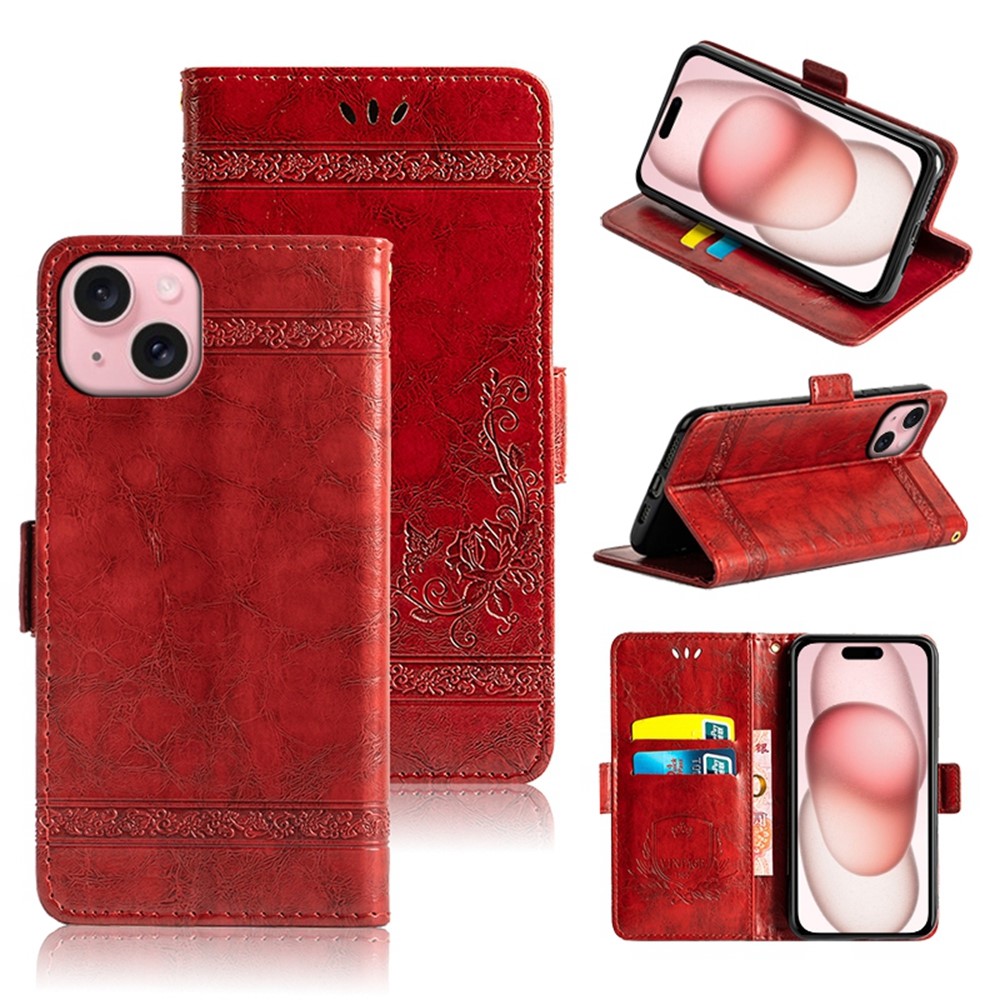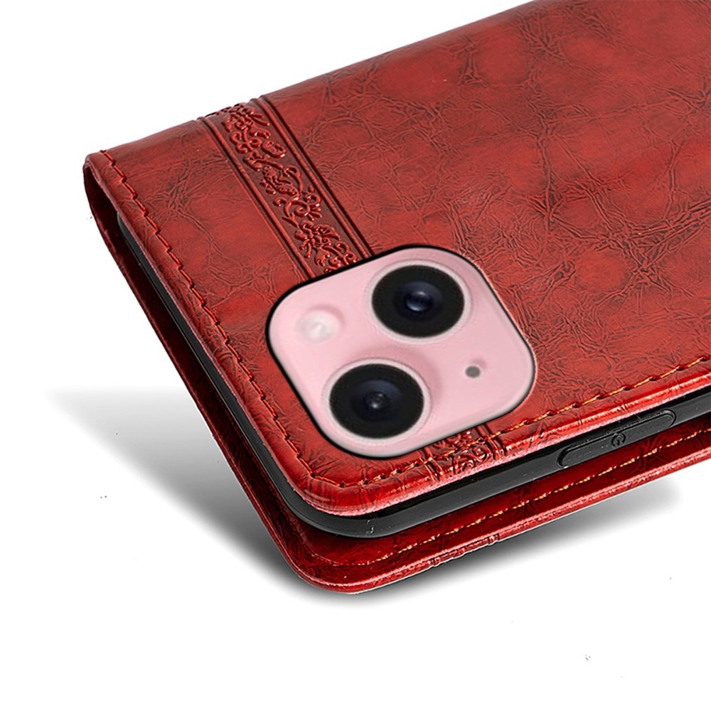 For iPhone 15 Leather Case Flower Imprint Wallet Phone Cover with Side Buckle - Red