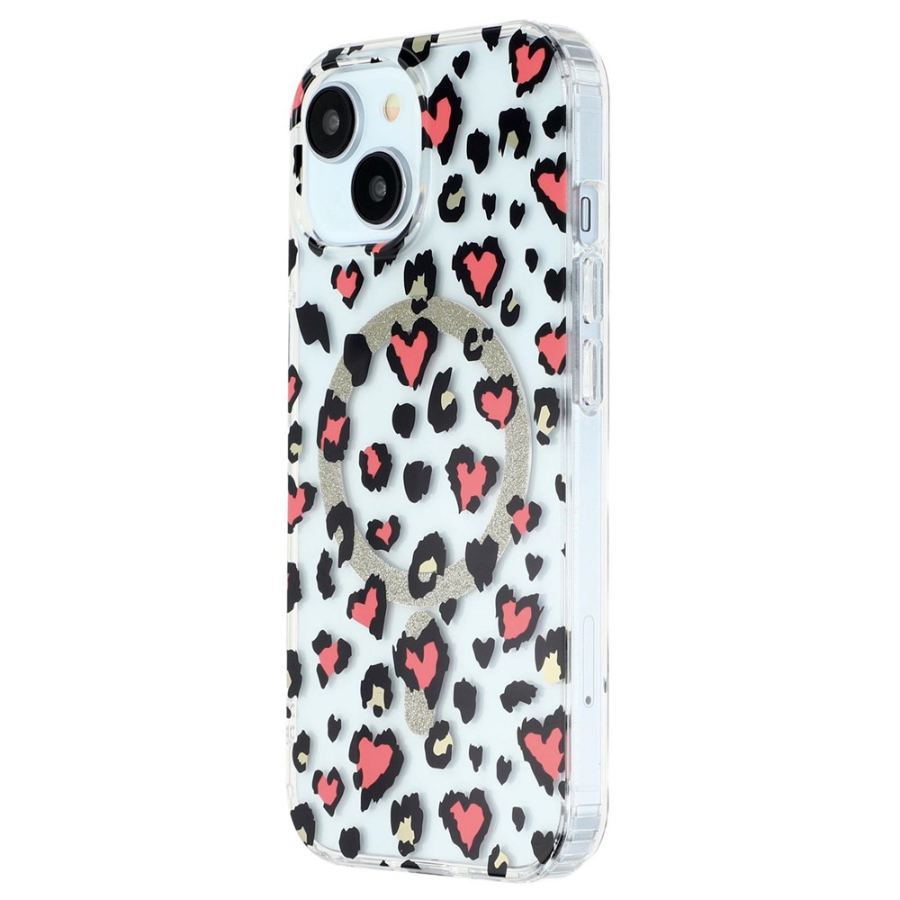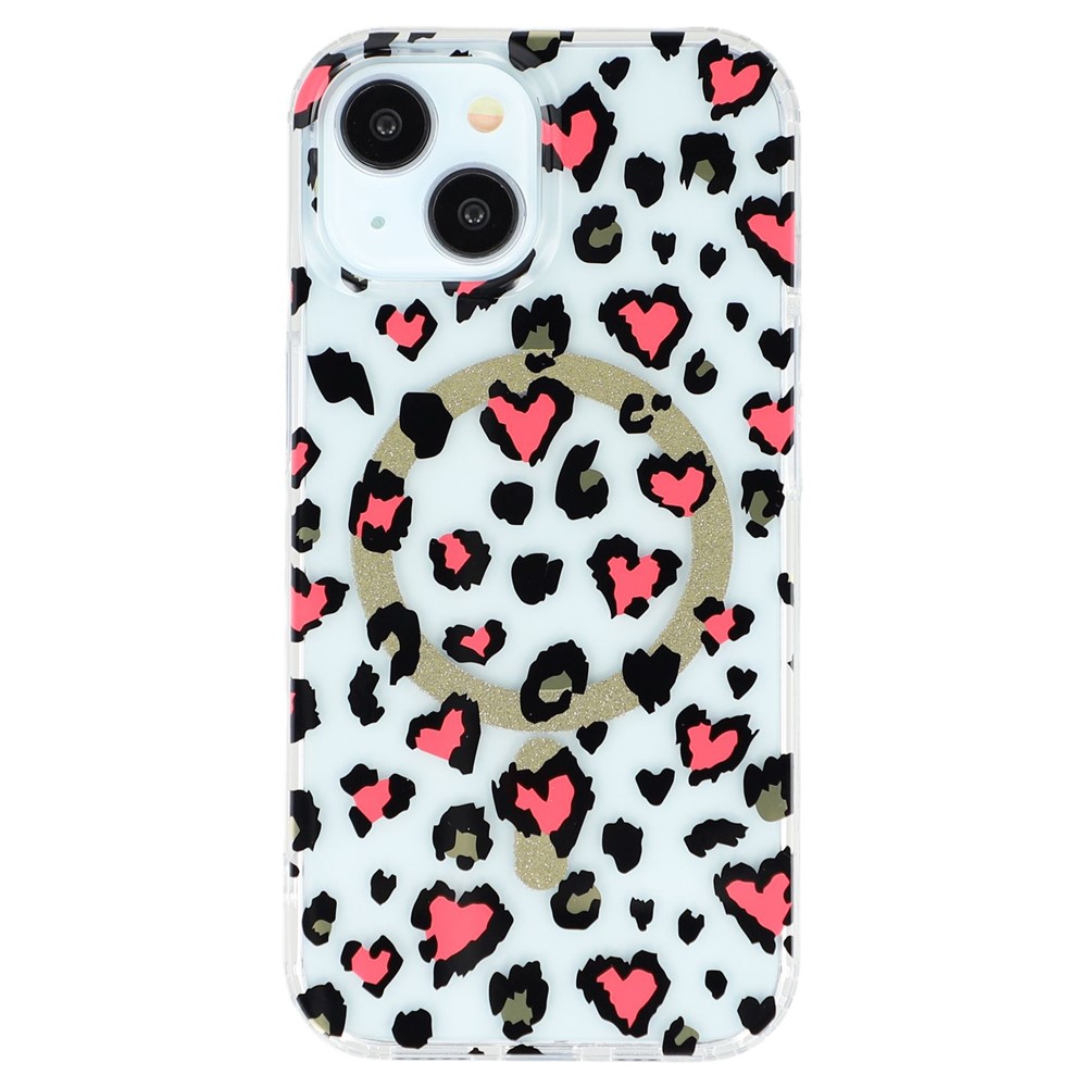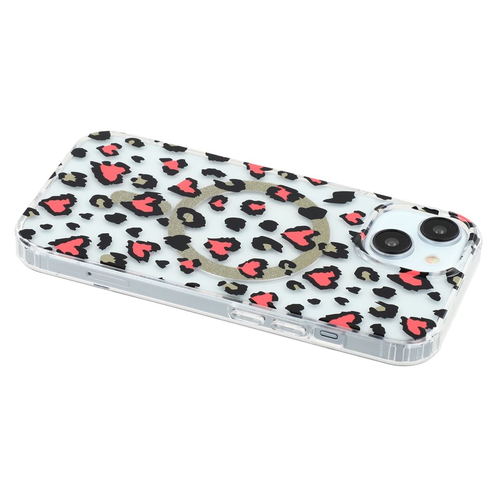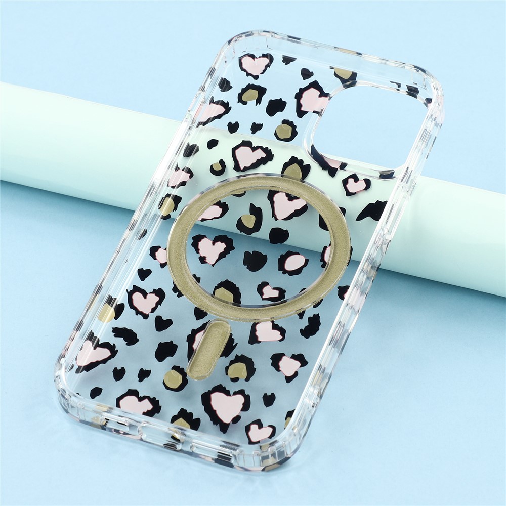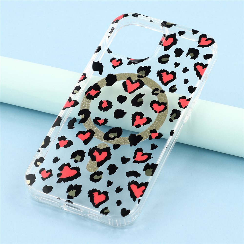 For iPhone 15 Magnetic Case Clear Anti-Yellowing PC + TPU Phone Back Cover Leopard Print Design – Red