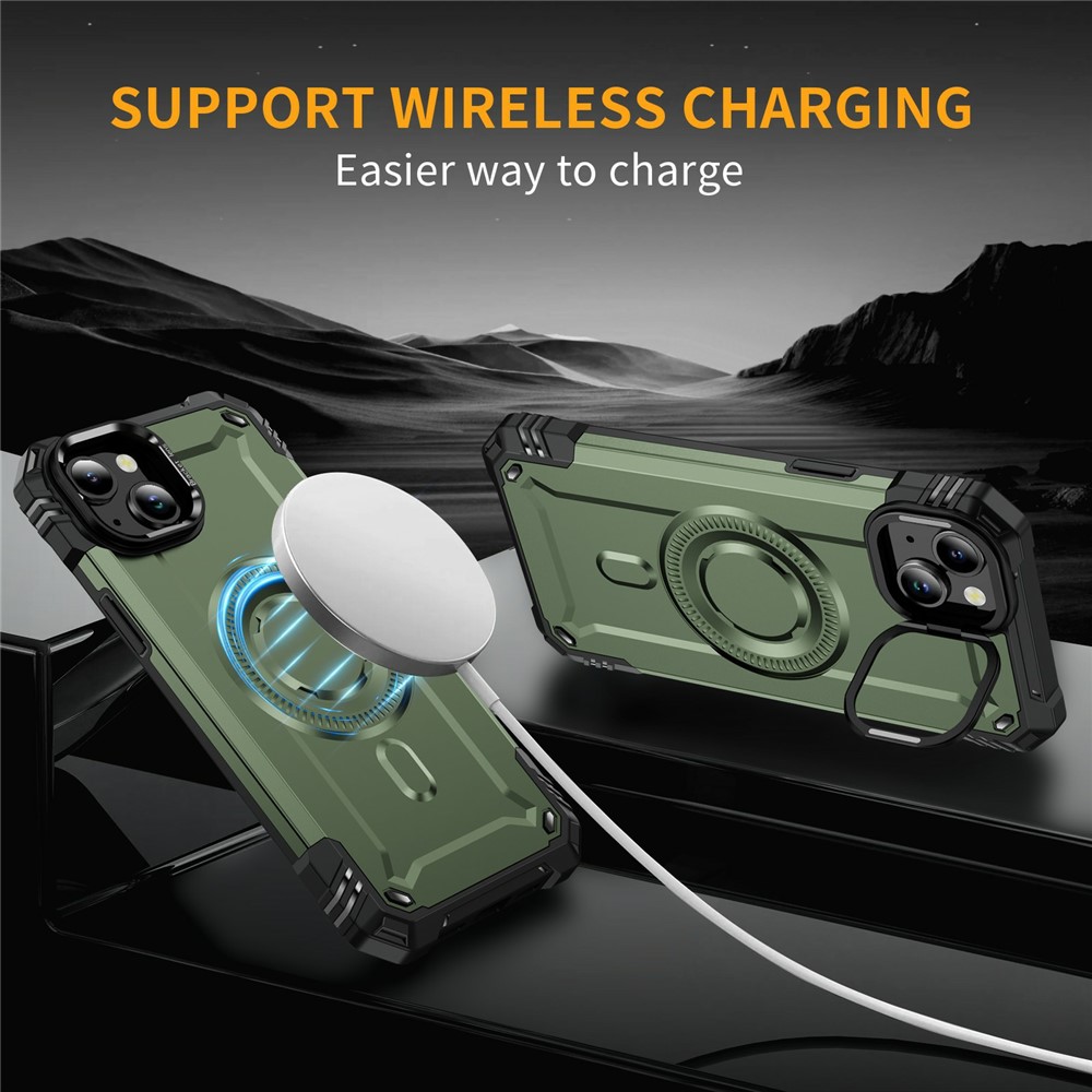 For iPhone 15 Magnetic Case Lens Kickstand PC + TPU Shockproof Phone Cover – Army Green