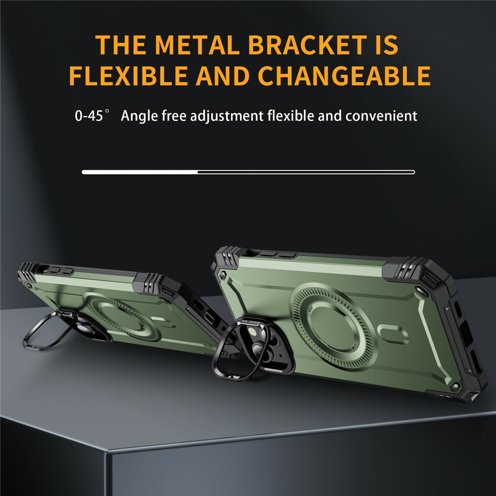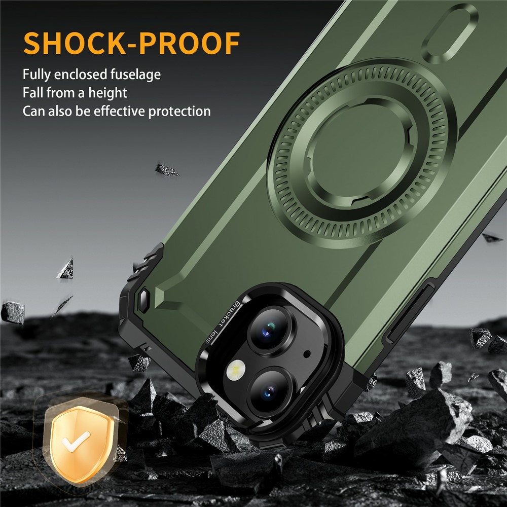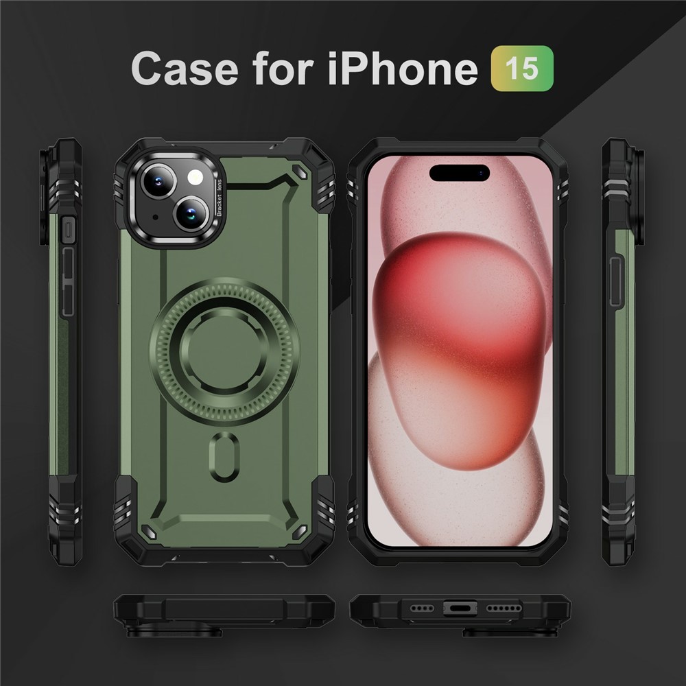 For iPhone 15 Magnetic Case Lens Kickstand PC + TPU Shockproof Phone Cover - Army Green $18.35