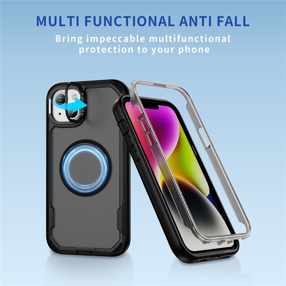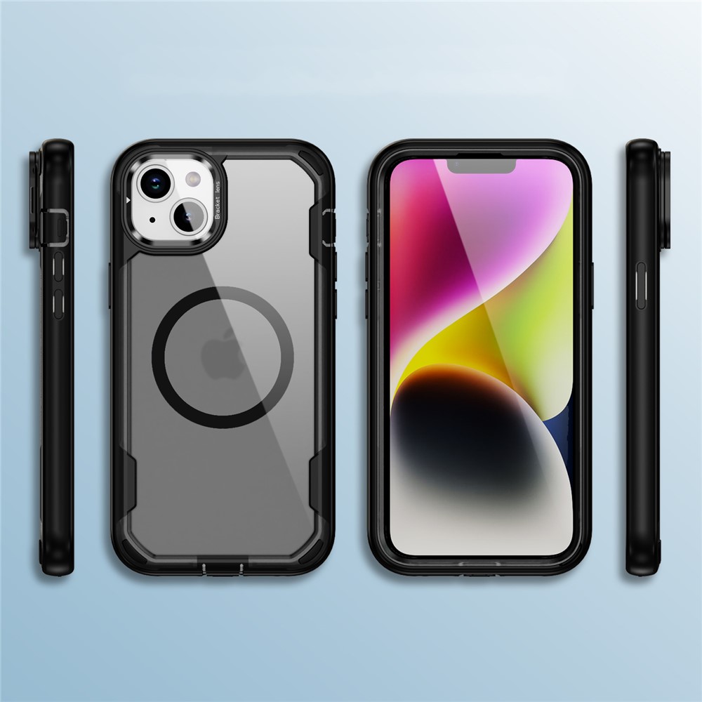 • For iPhone 15 Plus / 14 Plus Case Compatible with MagSafe Lens Frame Kickstand TPU + PC Shockproof Phone Cover - Black + Black