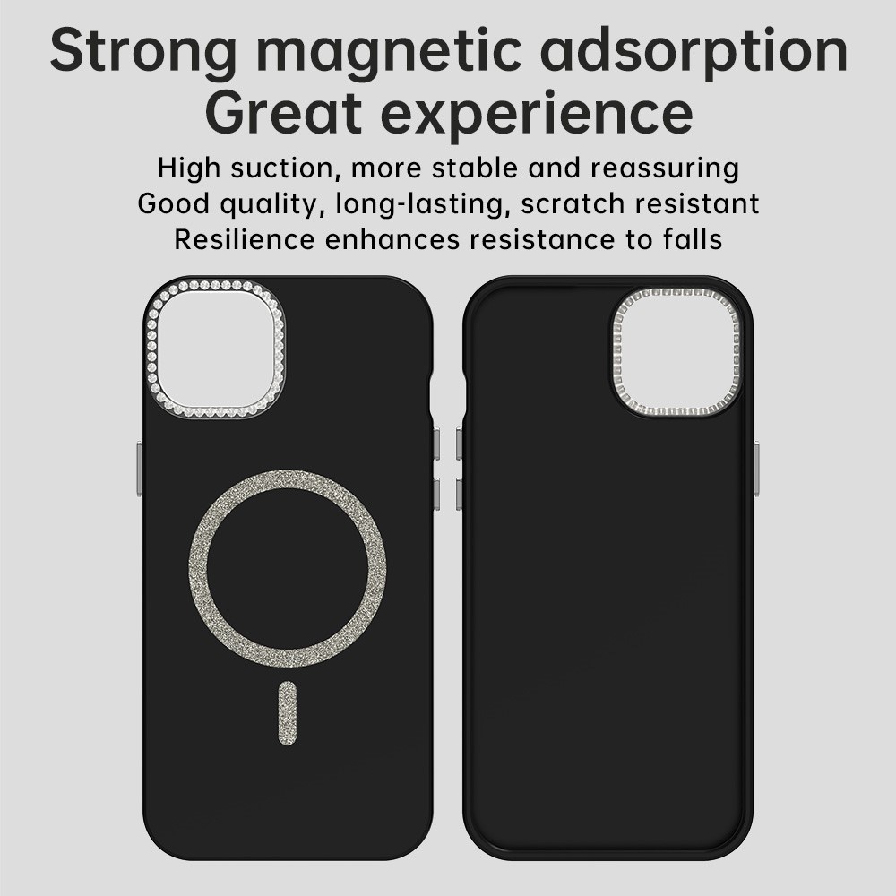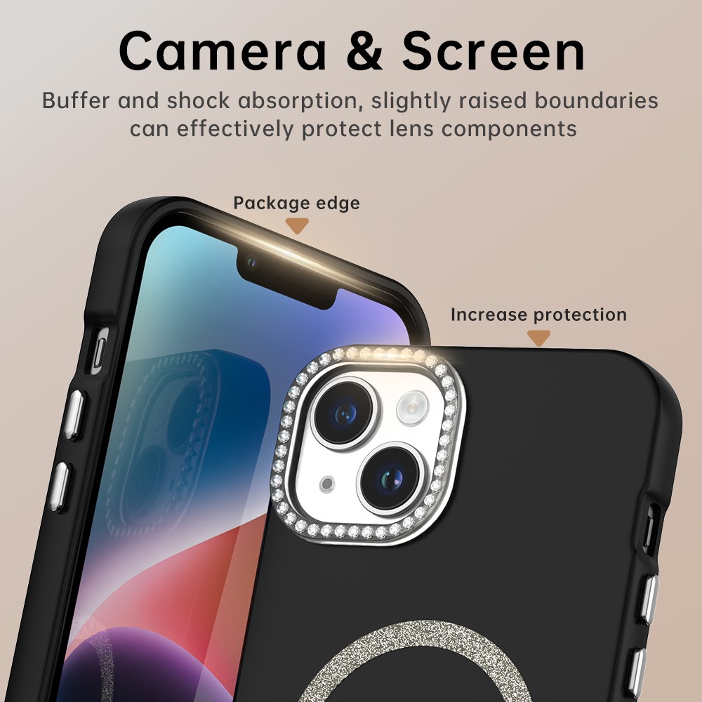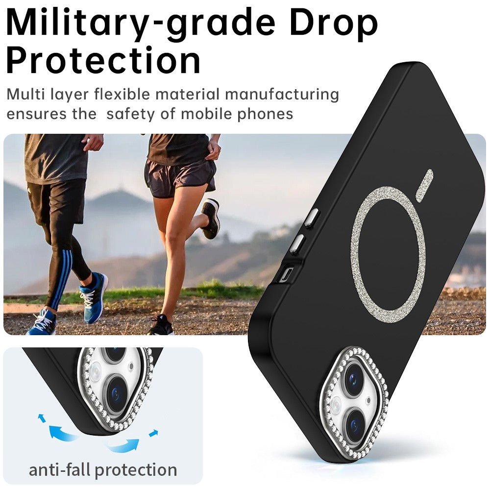 For iPhone 15 Plus / 14 Plus Case Compatible with MagSafe TPU + PET Phone Cover with Rhinestone Decor Lens Frame - Black $13.17
