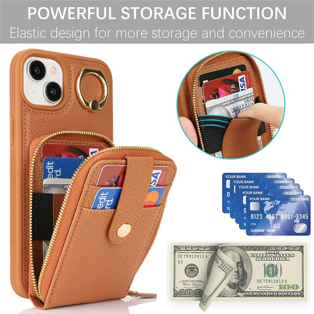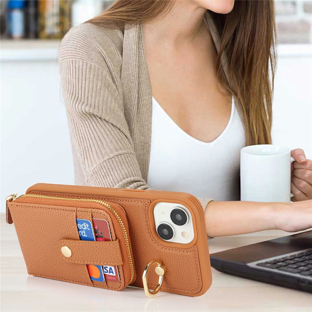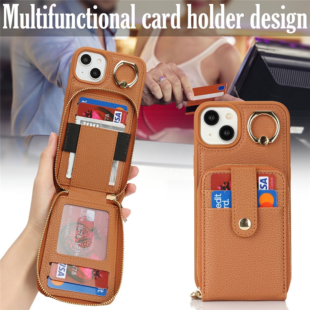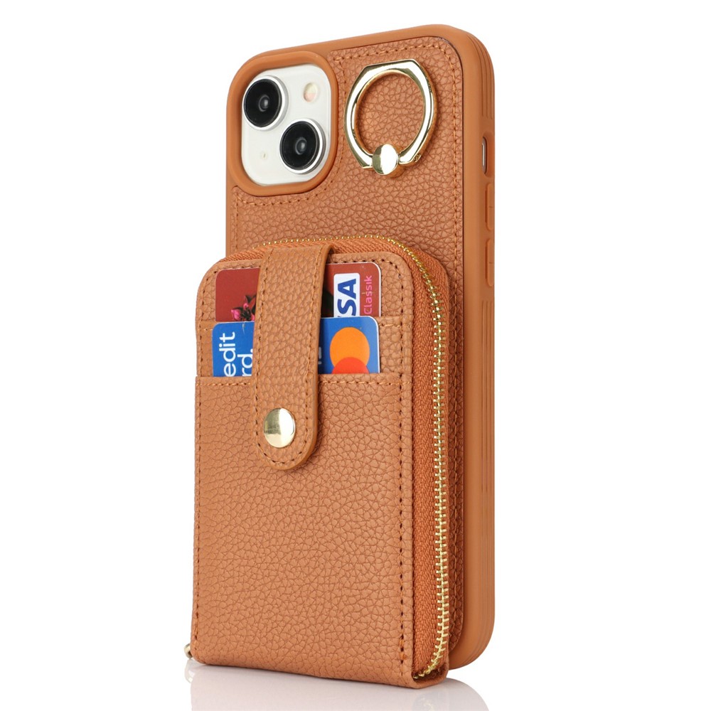 For iPhone 15 Plus / 14 Plus Case with Zipper Pouch / Ring Kickstand / Strap Litchi Texture PU + TPU Phone Cover – Brown