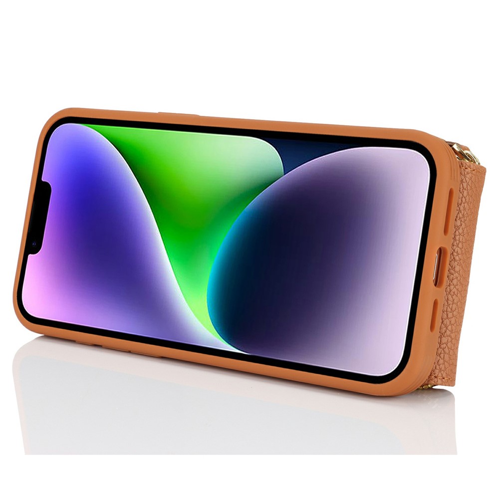 For iPhone 15 Plus / 14 Plus Case with Zipper Pouch / Ring Kickstand / Strap Litchi Texture PU + TPU Phone Cover - Brown $20.76