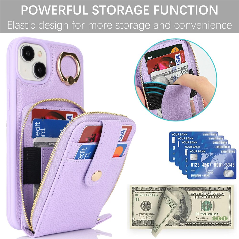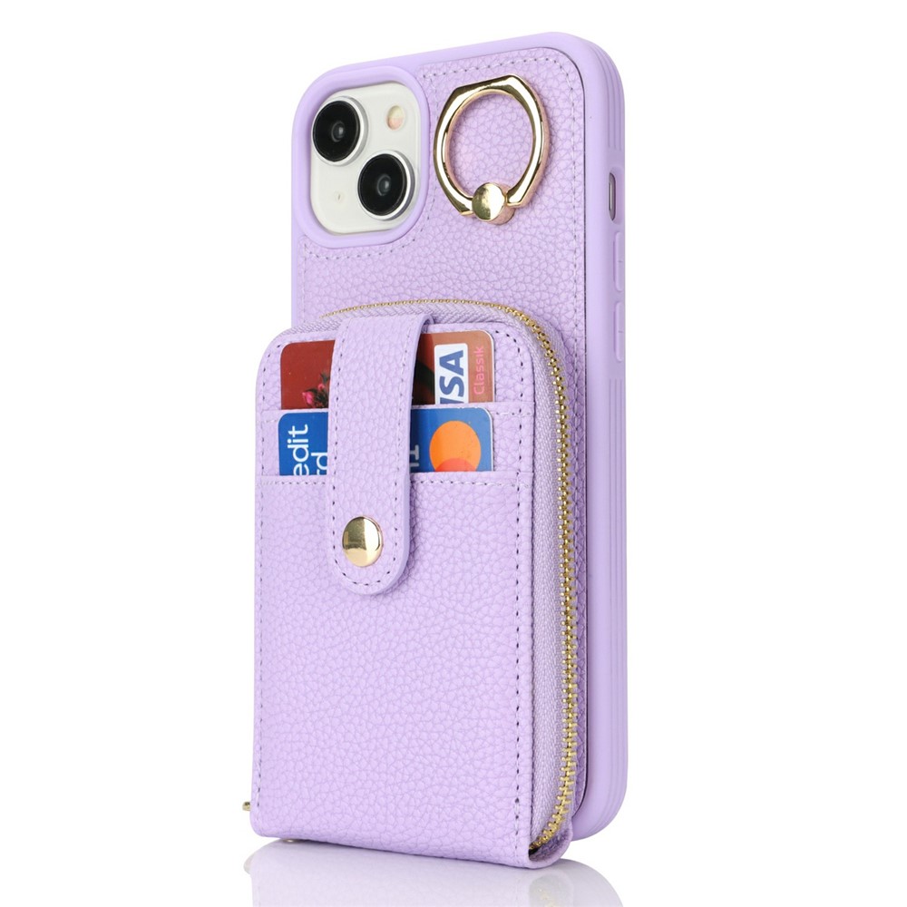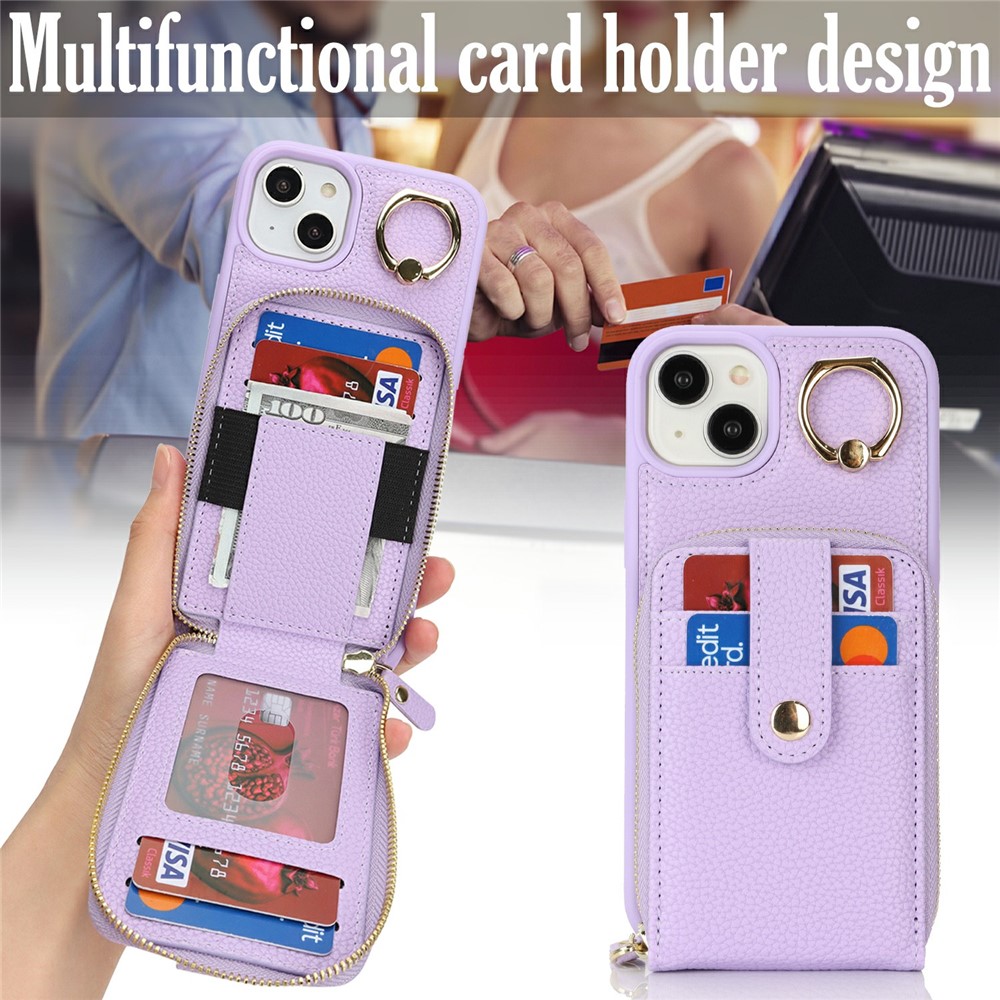 For iPhone 15 Plus / 14 Plus Case with Zipper Pouch / Ring Kickstand / Strap Litchi Texture PU + TPU Phone Cover – Purple