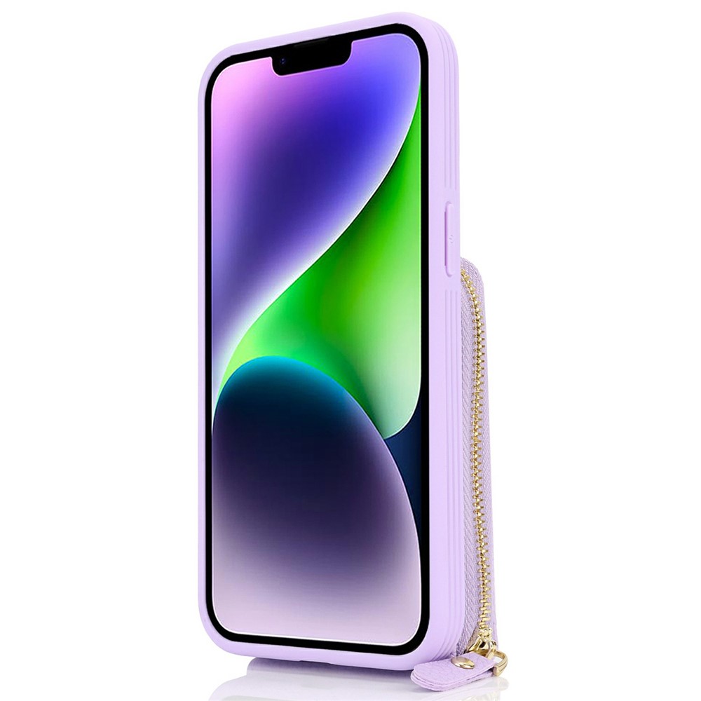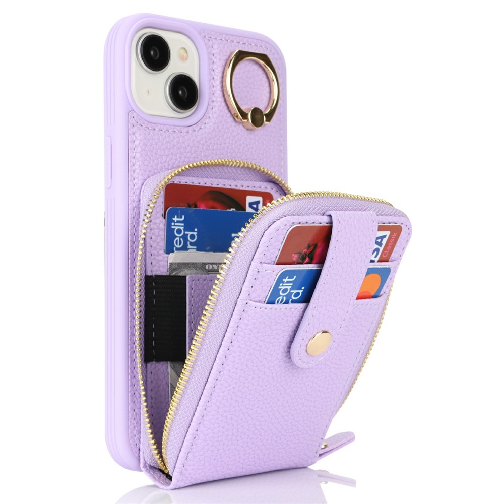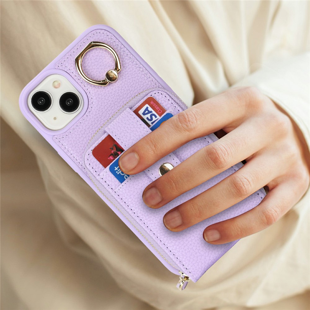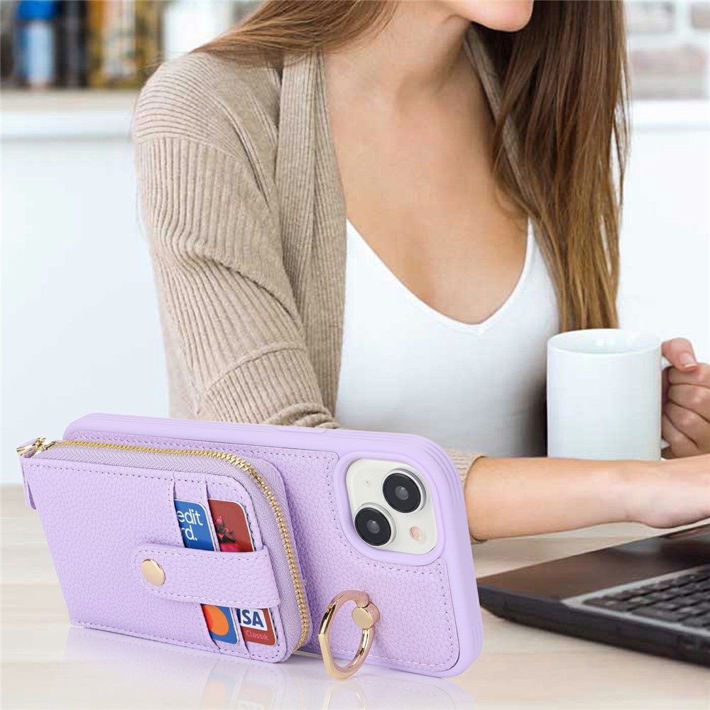 For iPhone 15 Plus / 14 Plus Case with Zipper Pouch / Ring Kickstand / Strap Litchi Texture PU + TPU Phone Cover – Purple