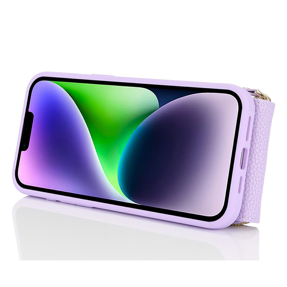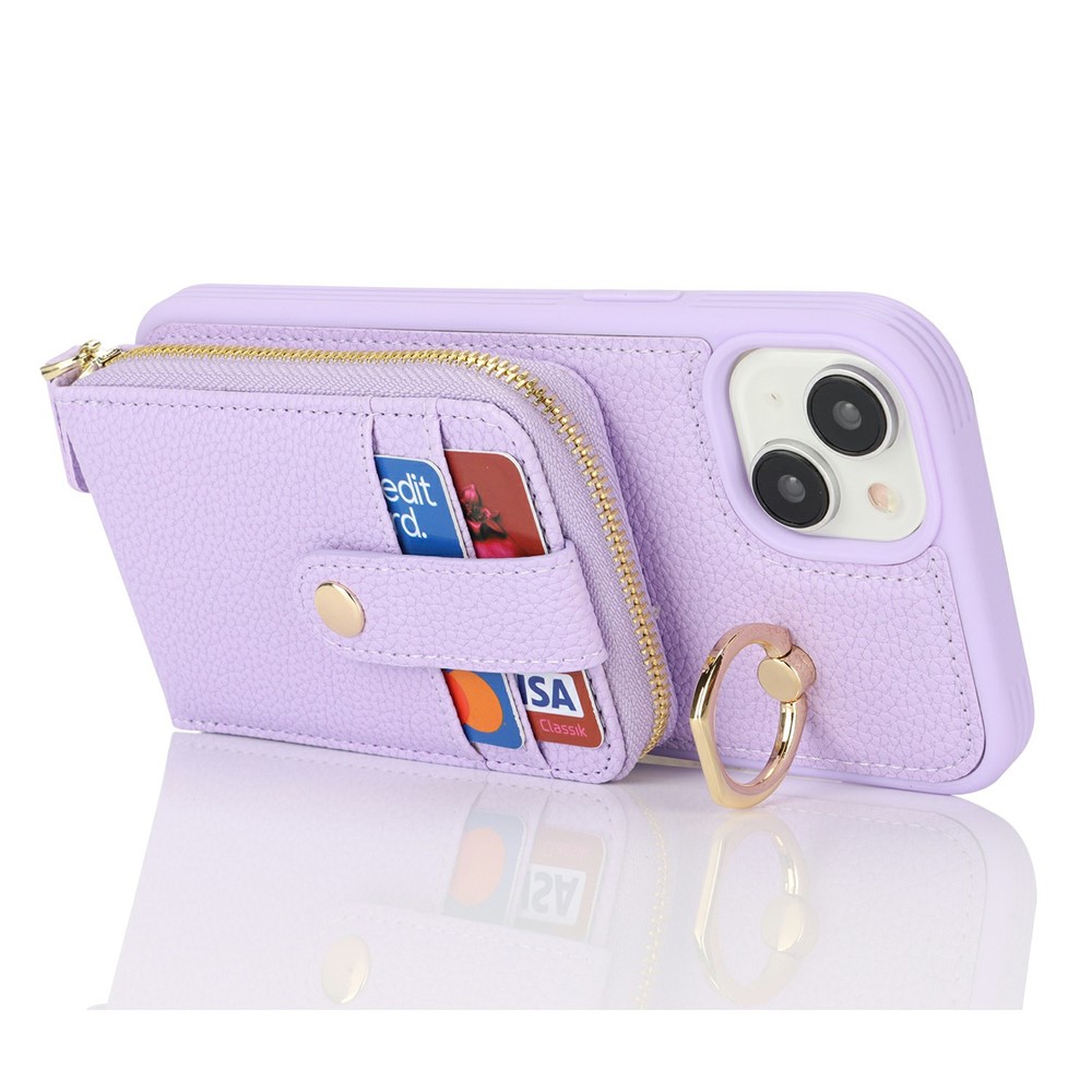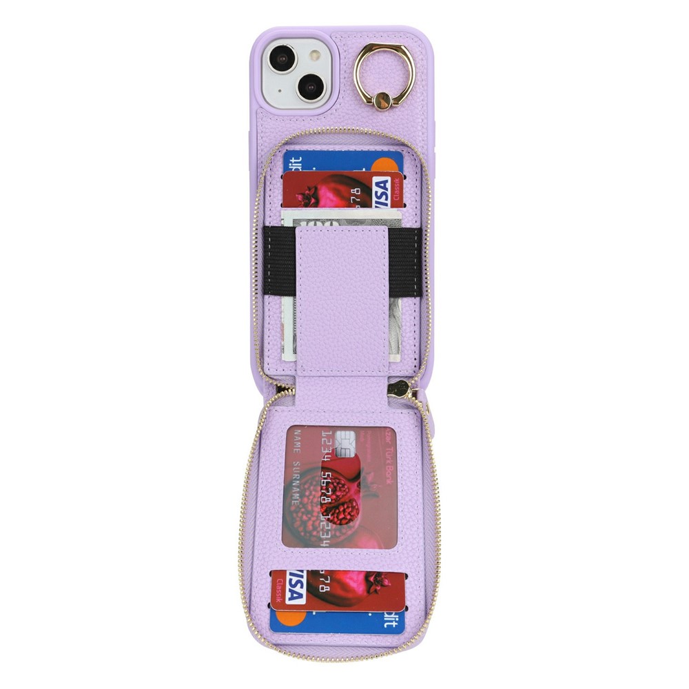 For iPhone 15 Plus / 14 Plus Case with Zipper Pouch / Ring Kickstand / Strap Litchi Texture PU + TPU Phone Cover - Purple $20.76
