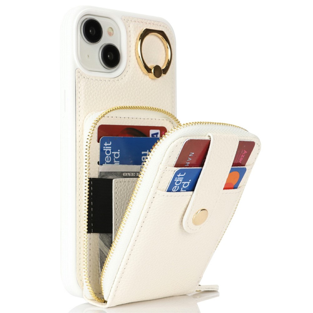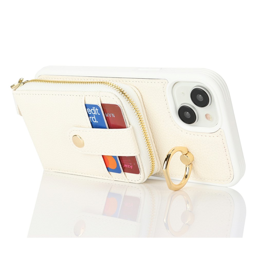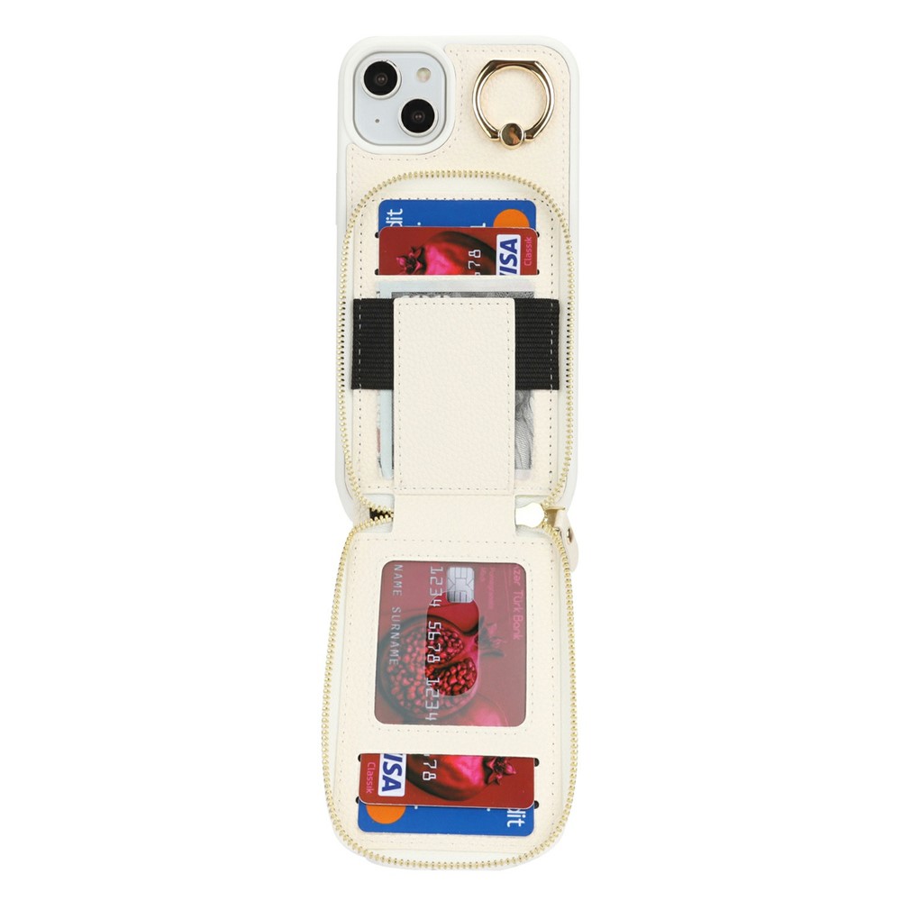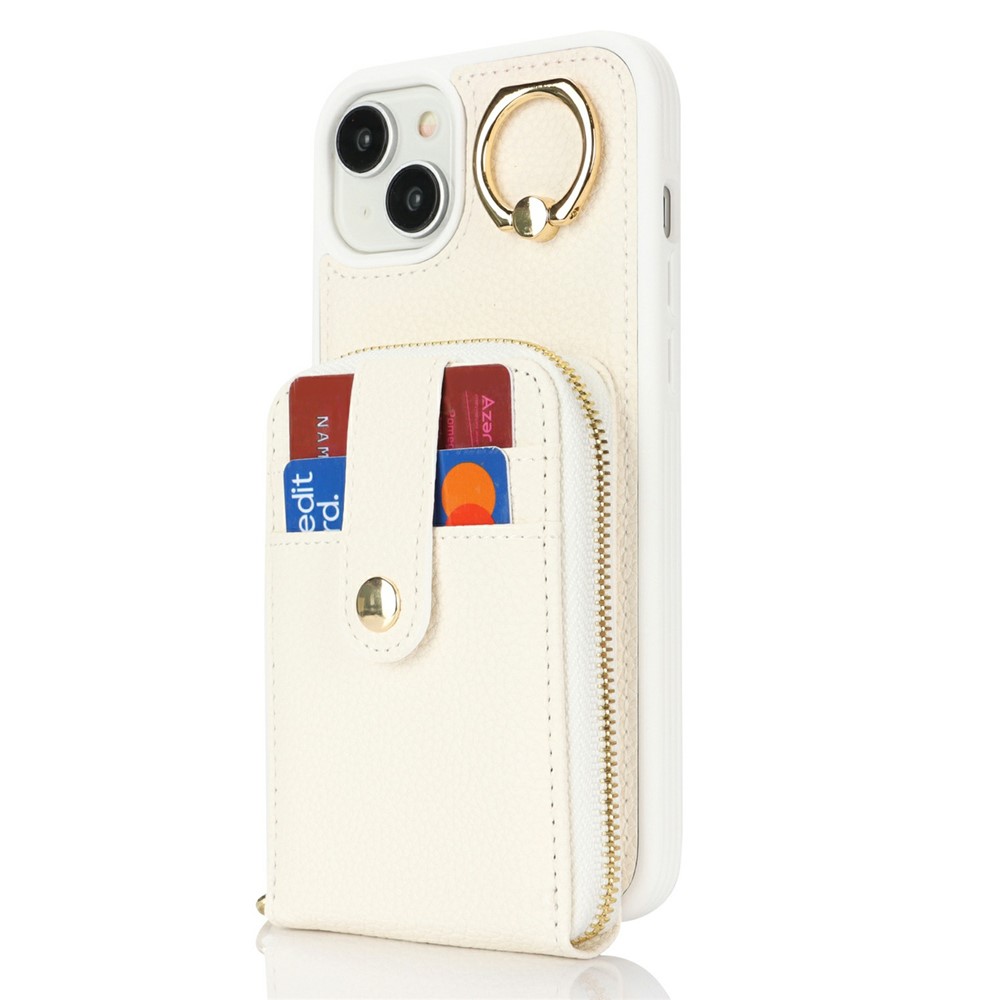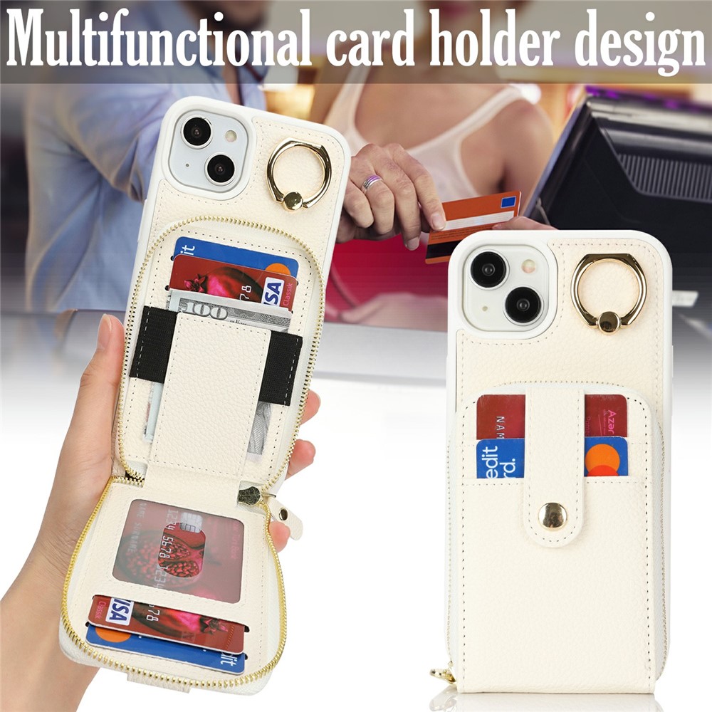 For iPhone 15 Plus / 14 Plus Case with Zipper Pouch / Ring Kickstand / Strap Litchi Texture PU + TPU Phone Cover - White